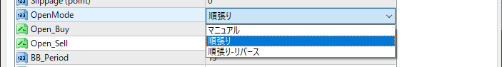 【フルオートでの順張り】 「OpenMode」を「順張り」に設定します。 取得と決済の両方を自動で行うことができます。 このモードを使う場合には、必ずやっていただきたいことがあります。それは、最適値のセットです。 デフォルトでも動きますが、今の市場に合わせた設定でトレードを行っていただけるようになります。
