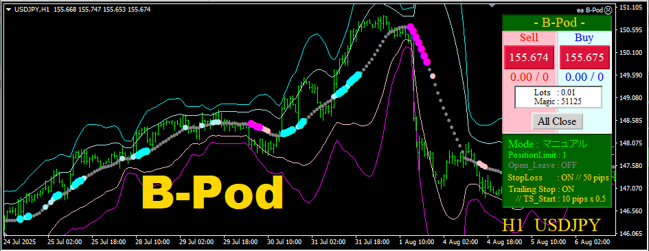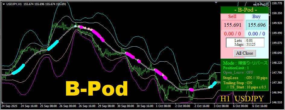 ■B-Pod(ビー・ポッド) このインジケータは内部的に「上昇」、「下降」、「レンジ」のいずれかの情報を常に保持しており、順張り特化した設計になっています。同時公開の『BB Rays(ビー・ビー・レイズ)』と、『Mookie Band(ムーキー・バンド)』とは、ここが大きく違う点です。 「上昇」、「下降」、「レンジ」、そしてその強弱を、ち密かつ高速に計算して把握していますので、今の相場に合わせたトレードを行うことができます。大きなトレンドの発生時には「順張り-リバース」で、大きな利幅を獲得できるのも『B-Pod』の特徴の一つです。