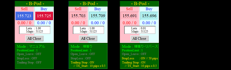 【決済を自動で行う半裁量】 「OpenMode」を「マニュアル」に設定します。 決済のみを自動で行いたい場合もこの設定です。 コントロールパネルのボタンでポジションを取得します。 ボタンの色は価格の上昇、下降で変化します。 保有中はポジションの数量、そして合計ロット数が表示されます。 自動決済とは別に手動で全決済をする場合は「AllClose」ボタン一つで一括決済することができます。 マジックナンバーにも対応していますので、他のマジックナンバーがふられているポジションには影響を与えません。