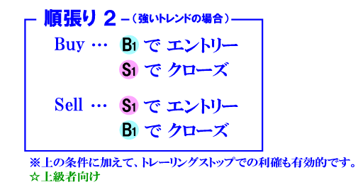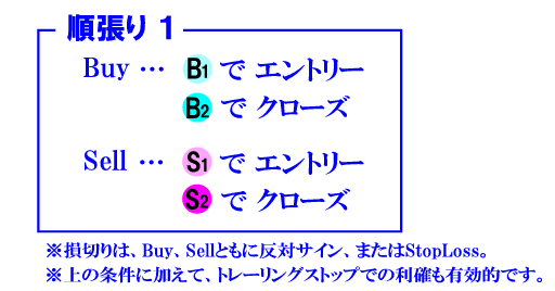 【フルオートでの順張り-リバース】 『Mookie Band』の特徴のひとつが、この「順張り-リバース」です。 「順張り」と取得タイミングは同じですが、決済タイミングが異なります。 反対サインでの決済です。 同一方向に継続的な値動きがあるときに大きな利益を獲得することができます。