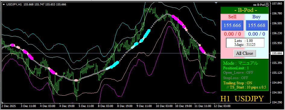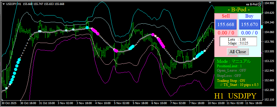 このモードでは、取得ポイントと決済ポイントを内部で高速に計算をしています。 裁量トレードでご説明したポイントとは別に、特有のタイミングで取得・決済を行います。 その他、こちらでも「Close StopLoss」と「Close Trailing Stop」を決済条件に付加することができます。 フルオート利用時は、マシン負荷への軽減、そして処理の高速化のため、インジケータはセットしないことをお勧めします。