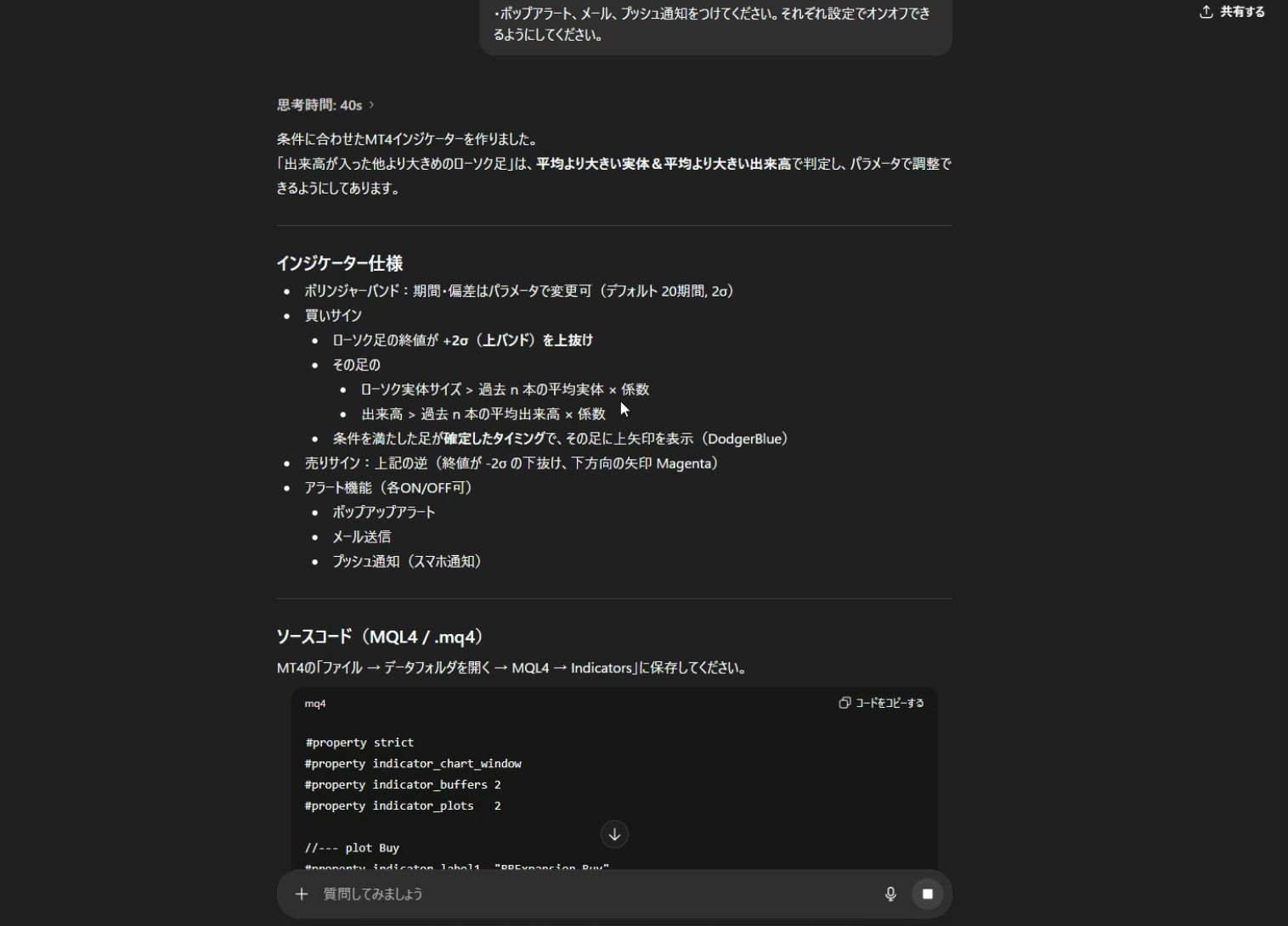 実際にAIで作ったインジです。誰でも作れるためサポートはありません。