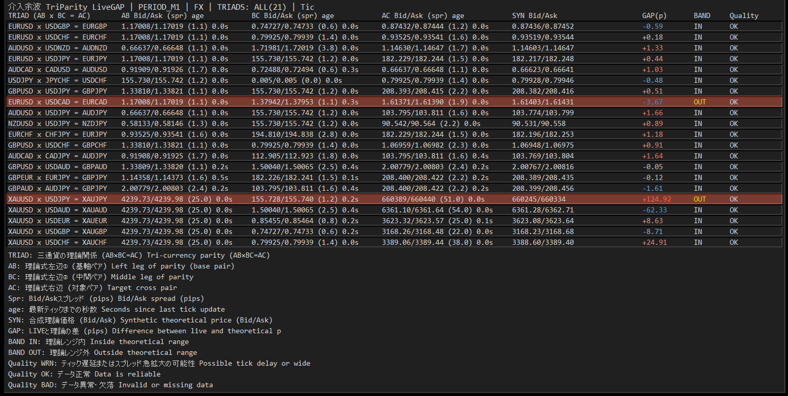 さらに Quality=OK(またはWRNでない) であれば、スプレッド拡大や更新ズレといった“データ要因”よりも、市場側の歪み(GAP)が実際に発生している可能性が高まります。。