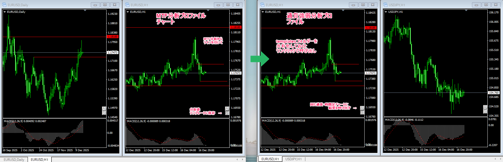 チャート再起動・MT4再起動後も再利用可能 Templatesフォルダーを共有化しておくと、別口座・別プロファイルのチャートにも一瞬で適用