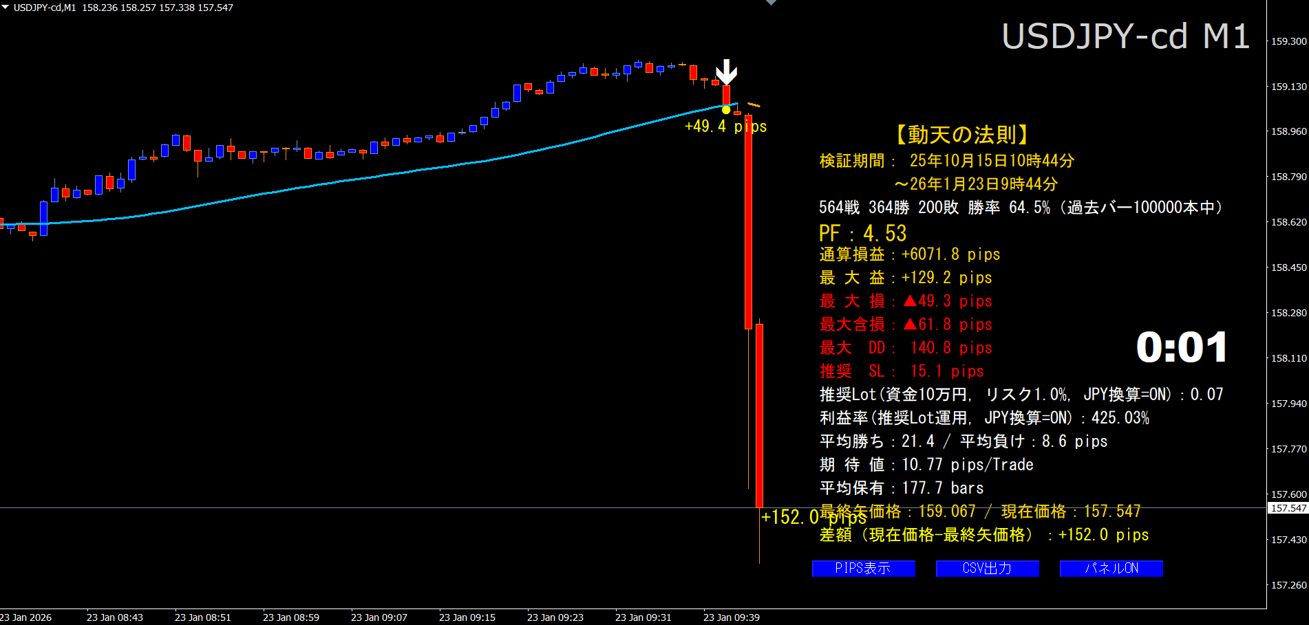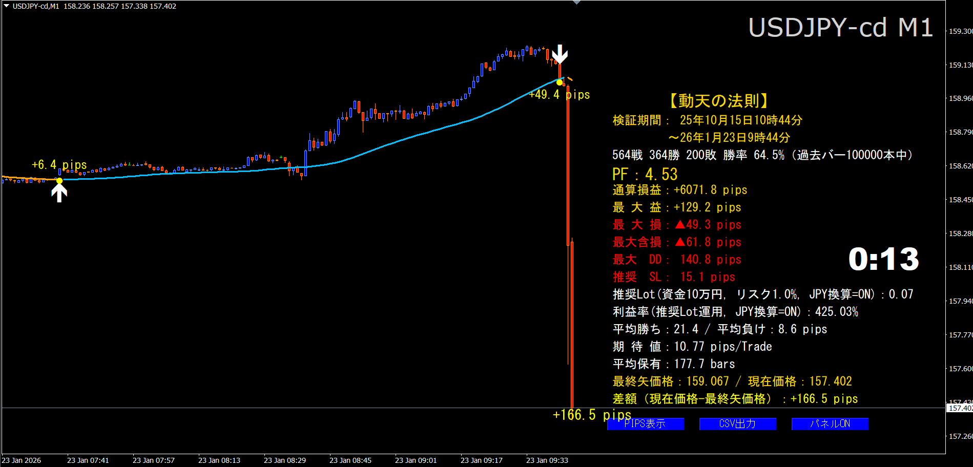 SMMA(平滑移動平均)角度ゲートにより、優位性の低いシグナルをフィルタした上で矢印とドットを描画します。加えて、シグナル間の確定pips、勝率・通算損益・最大DD等を自動集計し、CSV出力やプッシュ通知、ライブpips表示(右側)にも対応しています。