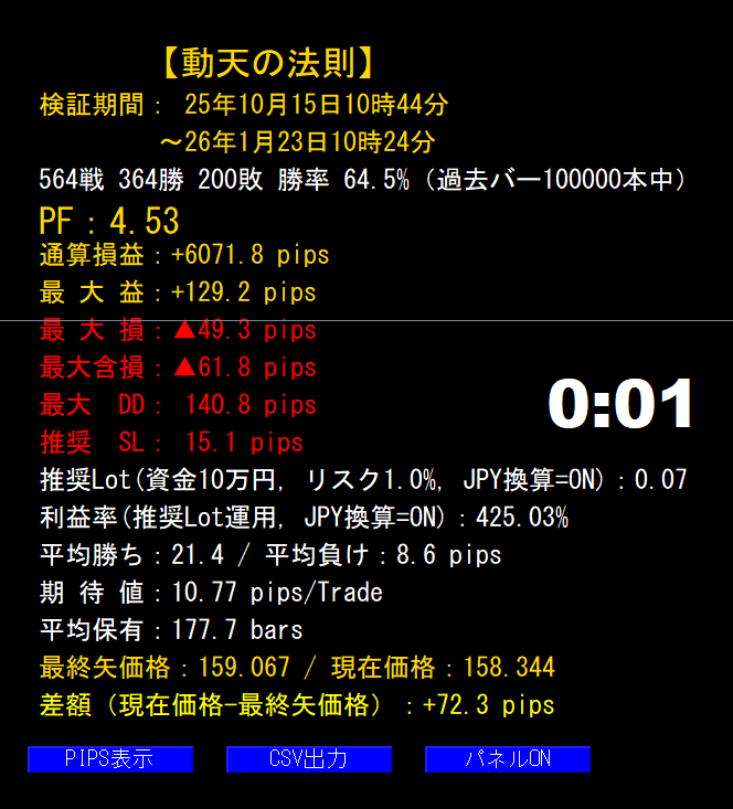 · 右下パネル:トレード数/勝敗/勝率、通算損益、最大益/損、最大含み損(MAE)、最大DD、推奨SL/ロット、期待値など
