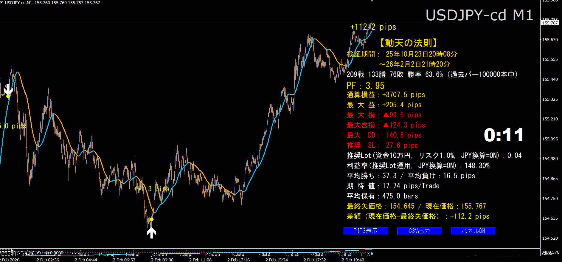 · 黄色/赤色のpips文字:シグナル間の確定損益(+は黄色、負は赤+▲)
