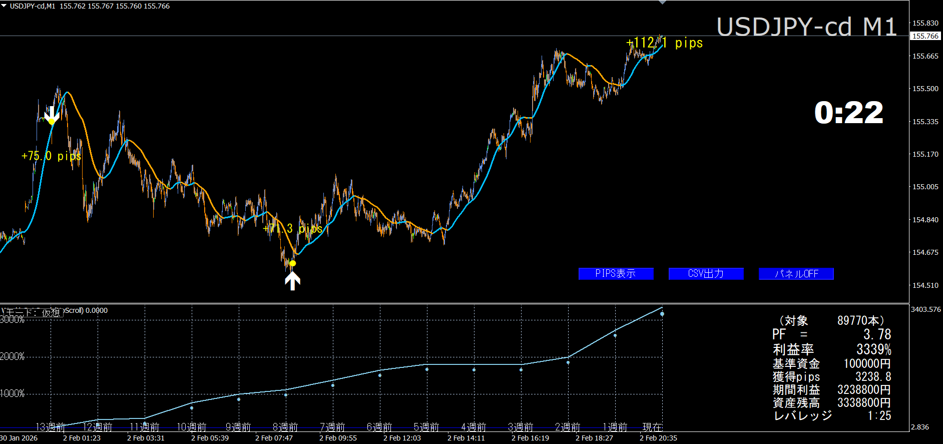 2. 矢印が新規方向で点灯すると前回の矢印との間のpipsが確定し、勝敗と通算が更新されます。