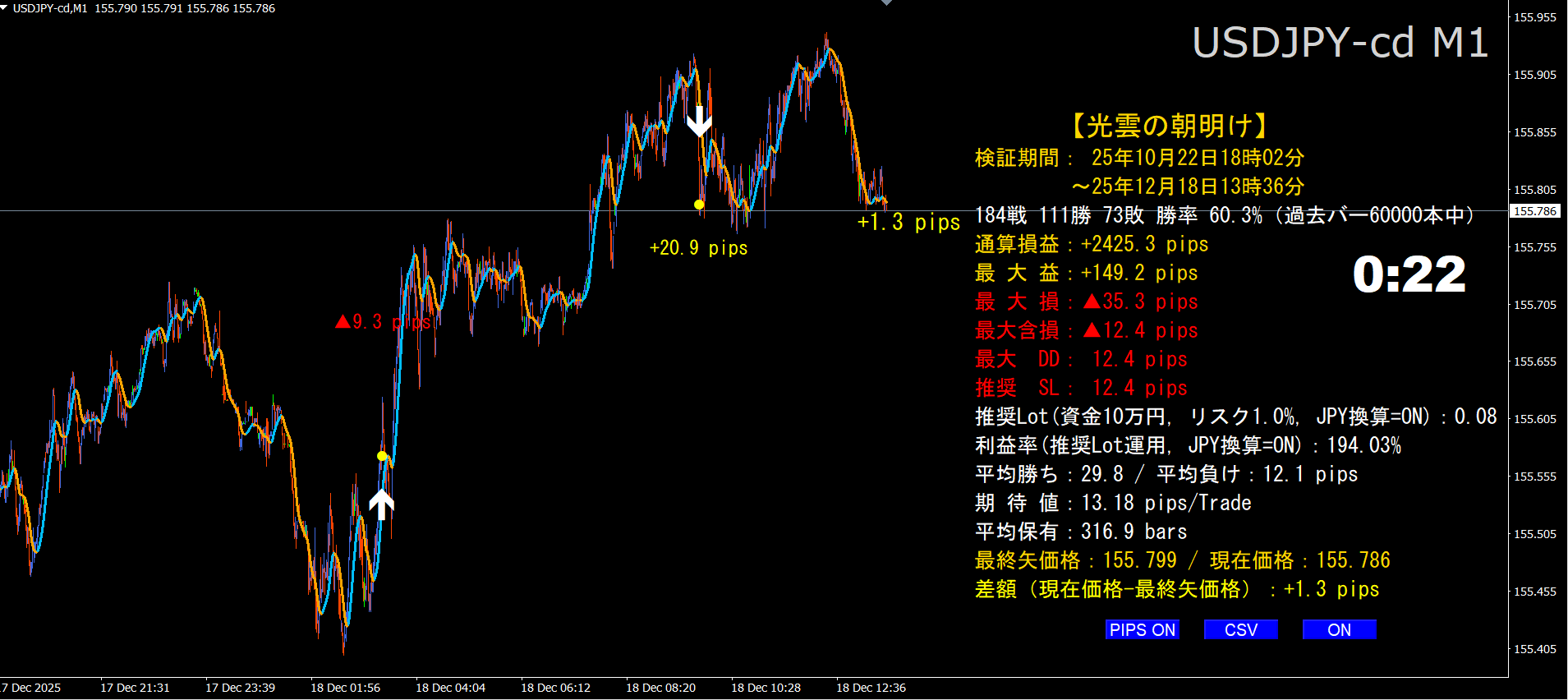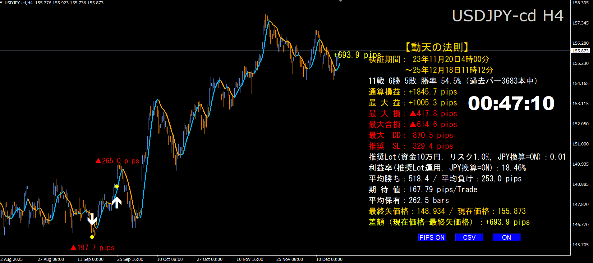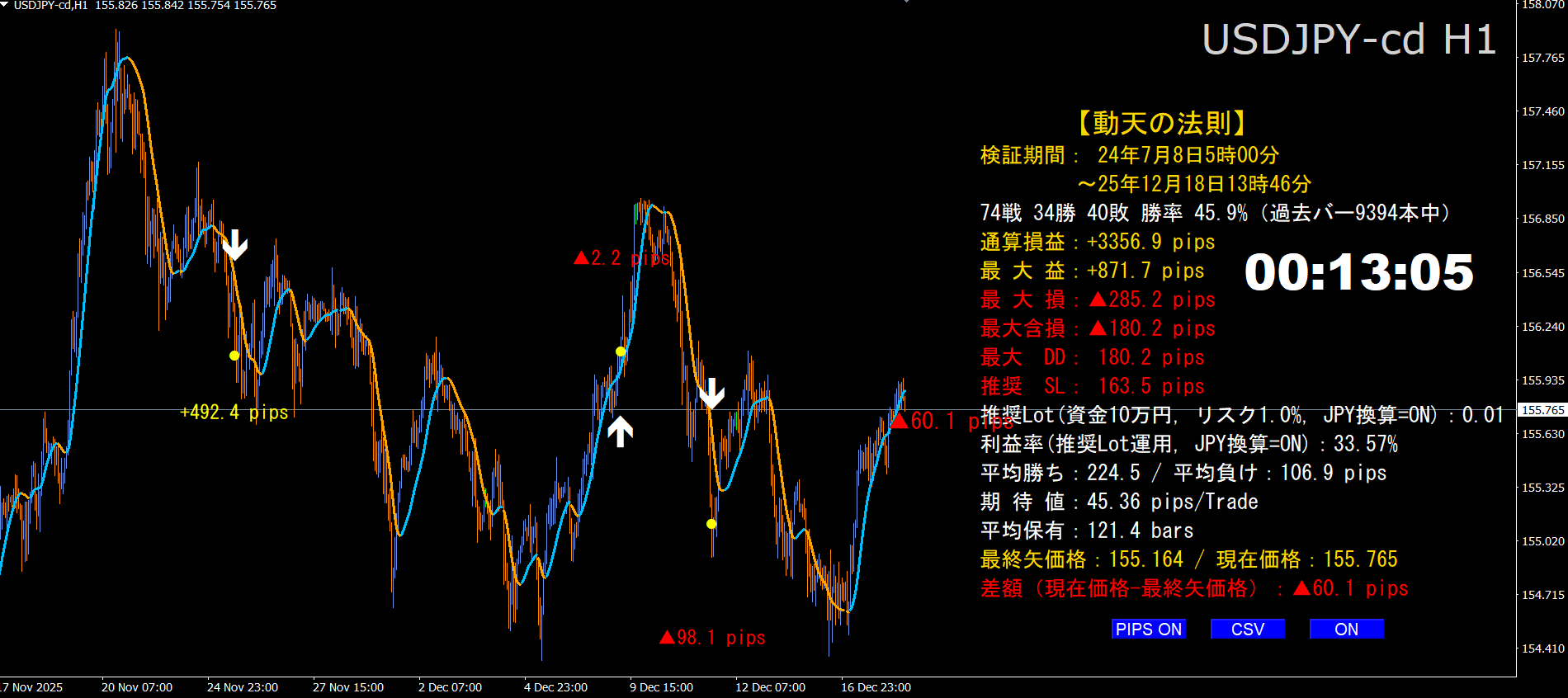 本インジケーターは、価格が一定期間の高値・安値レンジをブレイクした方向を検出し、交互制御(直近と同じ方向の連発を抑止)と SMMA(平滑移動平均)角度ゲートにより、優位性の低いシグナルをフィルタした上で矢印とドットを描画します。加えて、シグナル間の確定pips、勝率・通算損益・最大DD等を自動集計し、CSV出力やプッシュ通知、ライブpips表示(右側)にも対応しています。