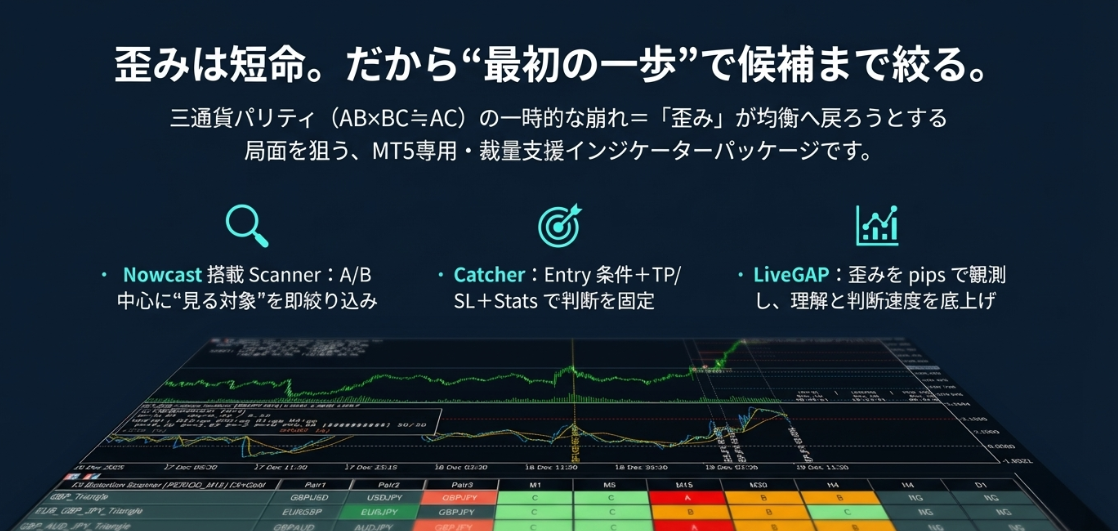 ScannerにNowcastを搭載し、意思決定プロセスを大幅に迅速化しました。 Scanner上でNowcast評価(A/B/C/NG)を同時に確認できるようになり、“見るべき通貨ペア/見送るべき通貨ペア”を即時に選別できます。これにより、従来よりも迷いが減り、判断が速くなる設計になりました。 LiveGAPの追加 三角通貨パリティに基づく理論価格(合成)と実勢価格の乖離(GAP)を可視化し、「歪みの発生→収束」を観測しやすくしました。(テスターでも再現可能です。)