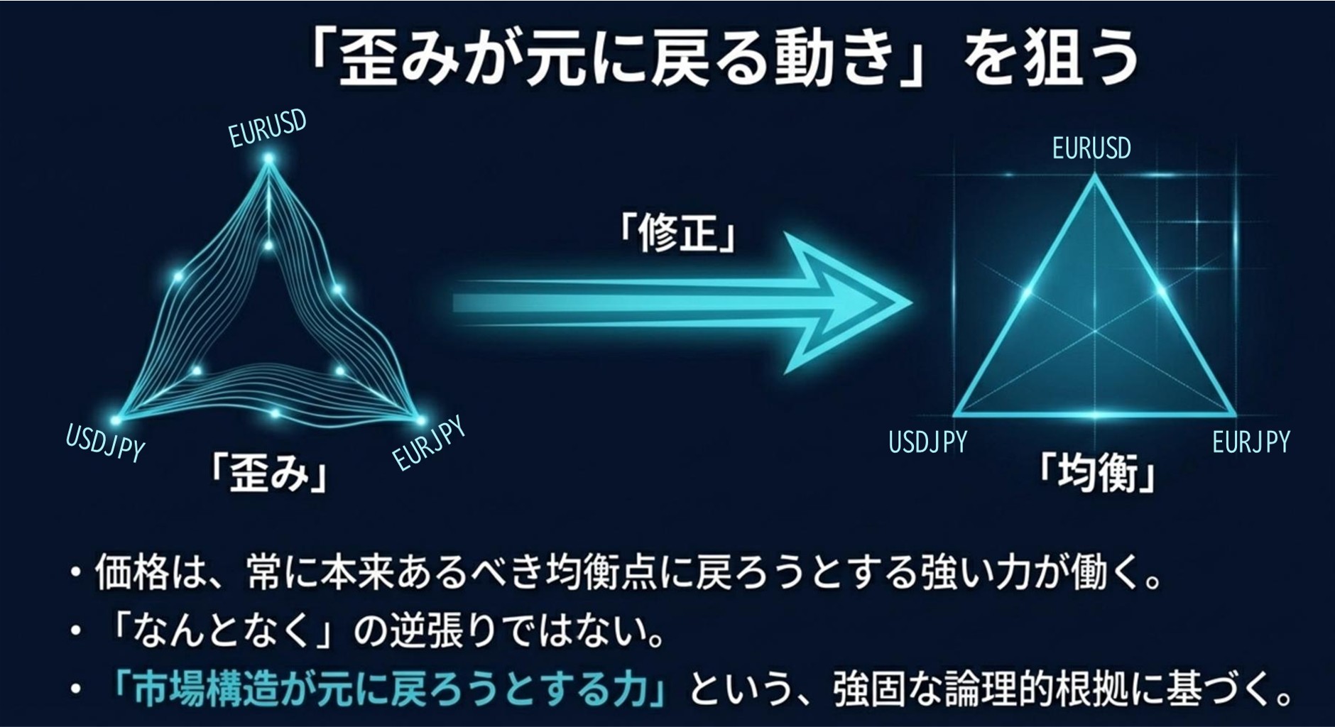 三通貨パリティ(AB×BC≒AC)の一時的な崩れ=「歪み」が均衡へ戻ろうとする局面を狙う