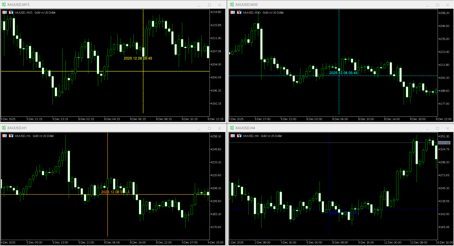 例えば、2020年12月10日15:00の位置に縦線を合わせて「L」キーを押すと、他の時間足チャートも同じ時刻の場所へ移動し、そのバーが画面の中央付近に来るように表示されます。