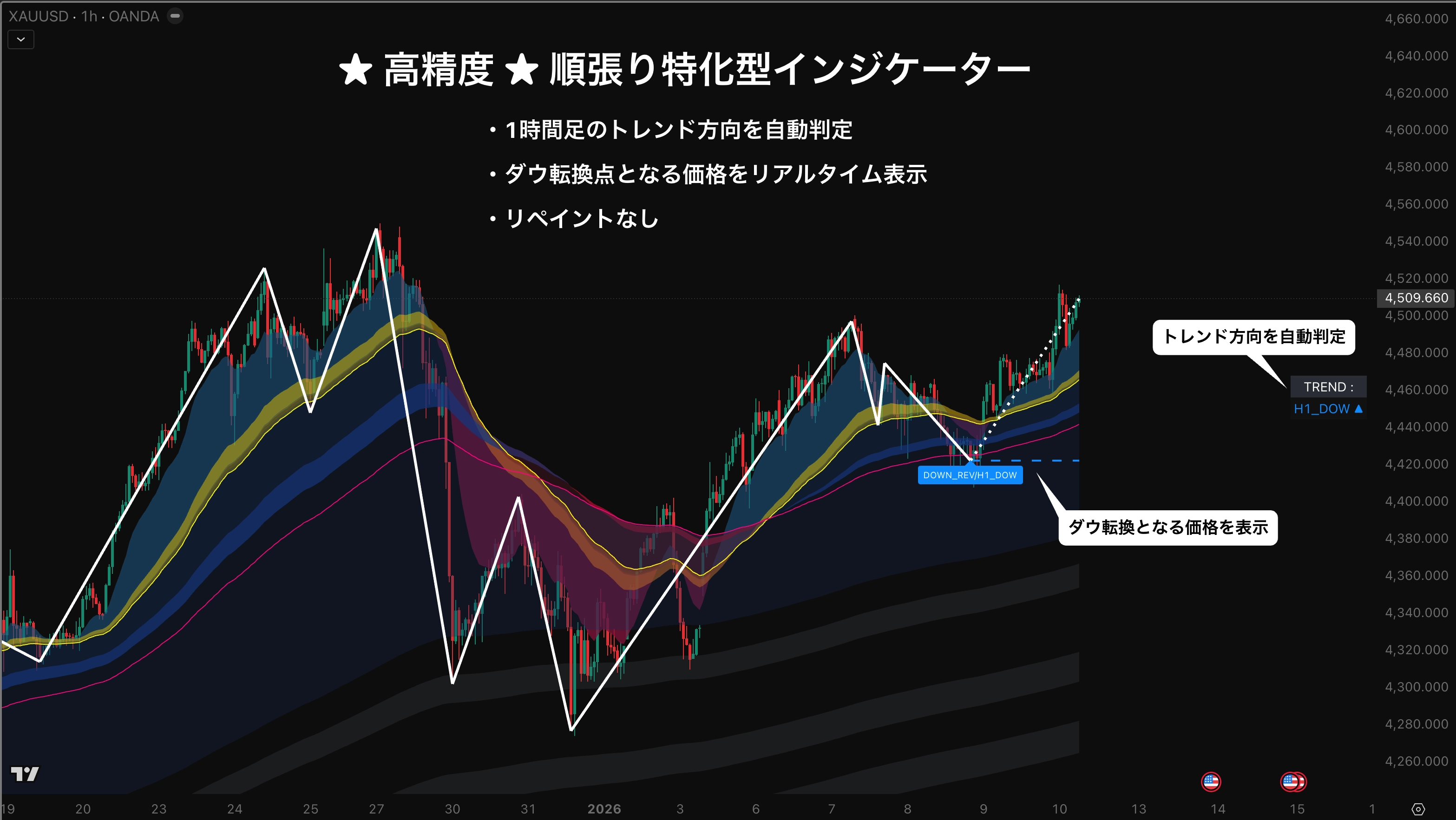 ダウ理論によるトレンド判定、トレンド反転する価格帯を自動描画するためのインジケーターです。リペイントすることなく、デイトレードにおいての順張りエントリー方向を可視化します。