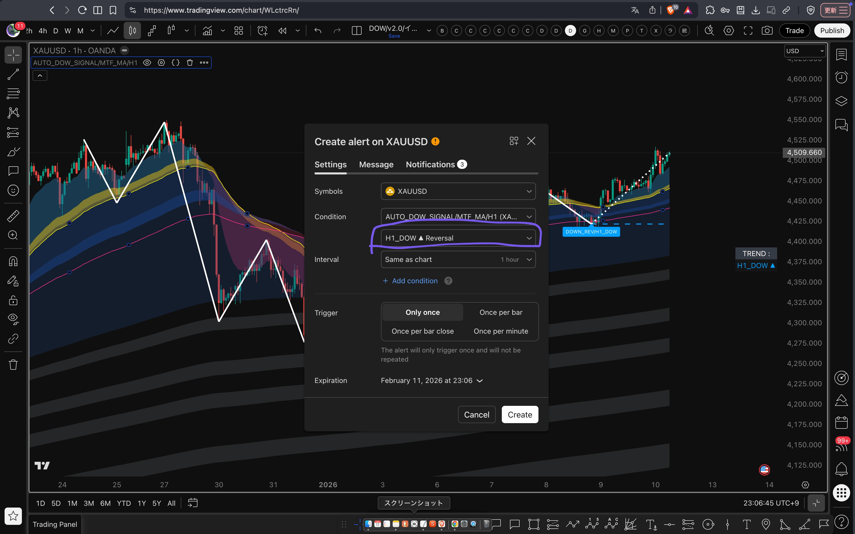 ダウ転換時、スマホ/PC( =TradingViewアプリ経由)にアラート送信できます。