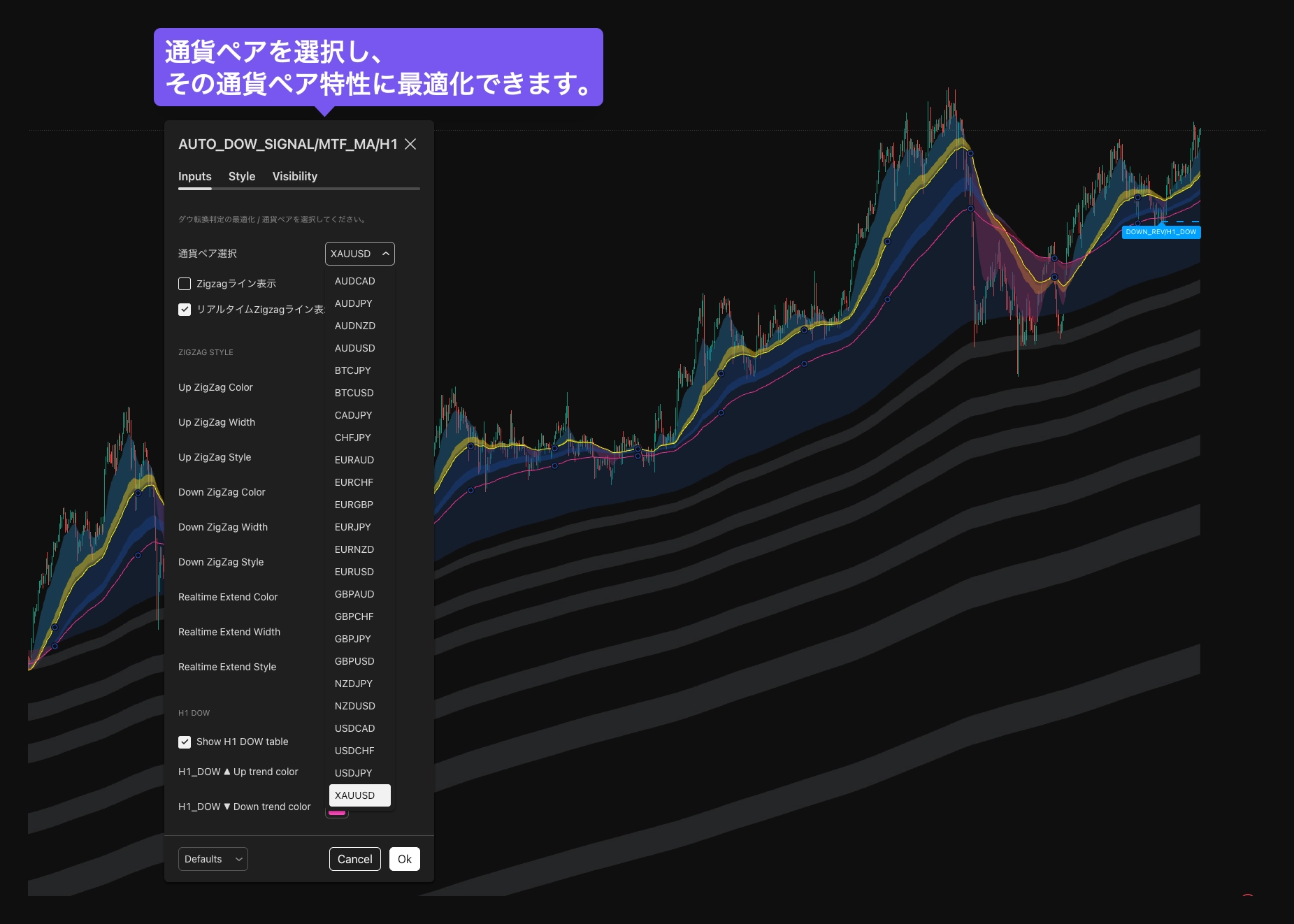 通常のZIGZAGラインではなく、ダウ判定に特化した独自のロジックを用いています。