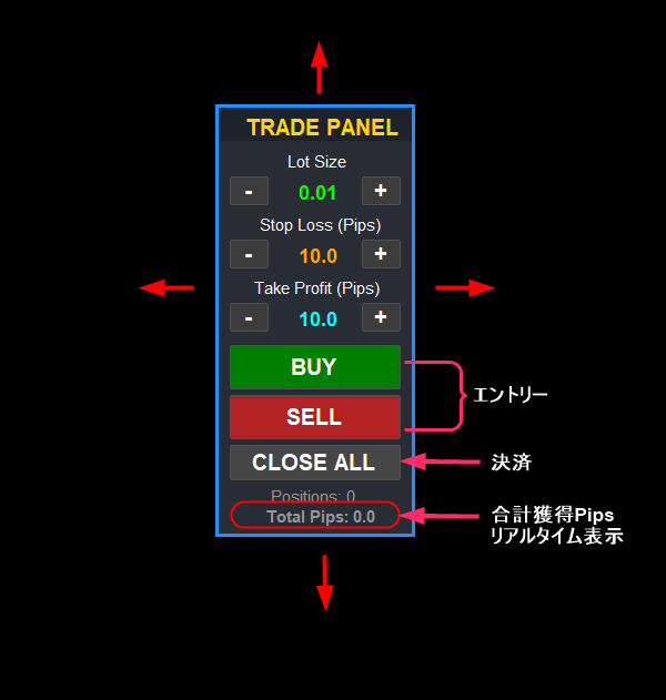 パネル下部にPositions(保有ポジション数)とTotal Pips(合計損益)をリアルタイムで表示します。
