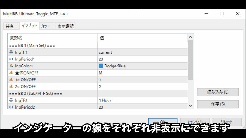 ボリンジャーバンドの線を一つずつ非表示にできるインジケーター 例 1シグマだけを消すとか全体を隠すとか