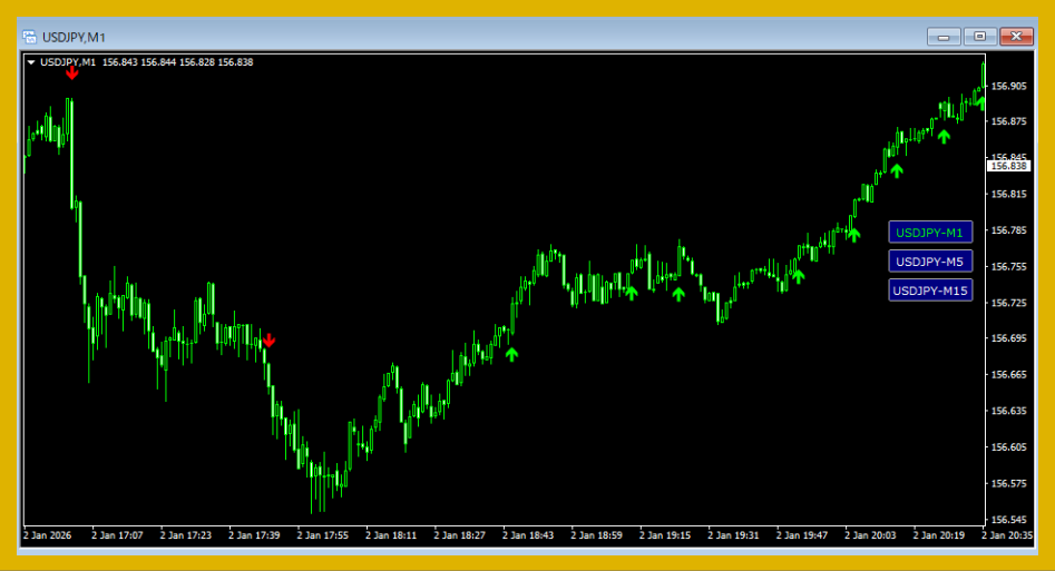 A. USDJPY専用に最適化した、M1/M5/M15の矢印サイン型インジケーターです。