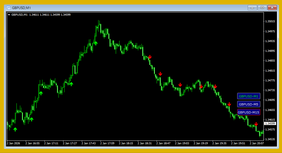 A. GBPUSD専用に最適化した、M1/M5/M15の矢印サイン型インジケーターです。