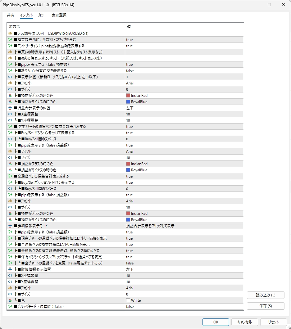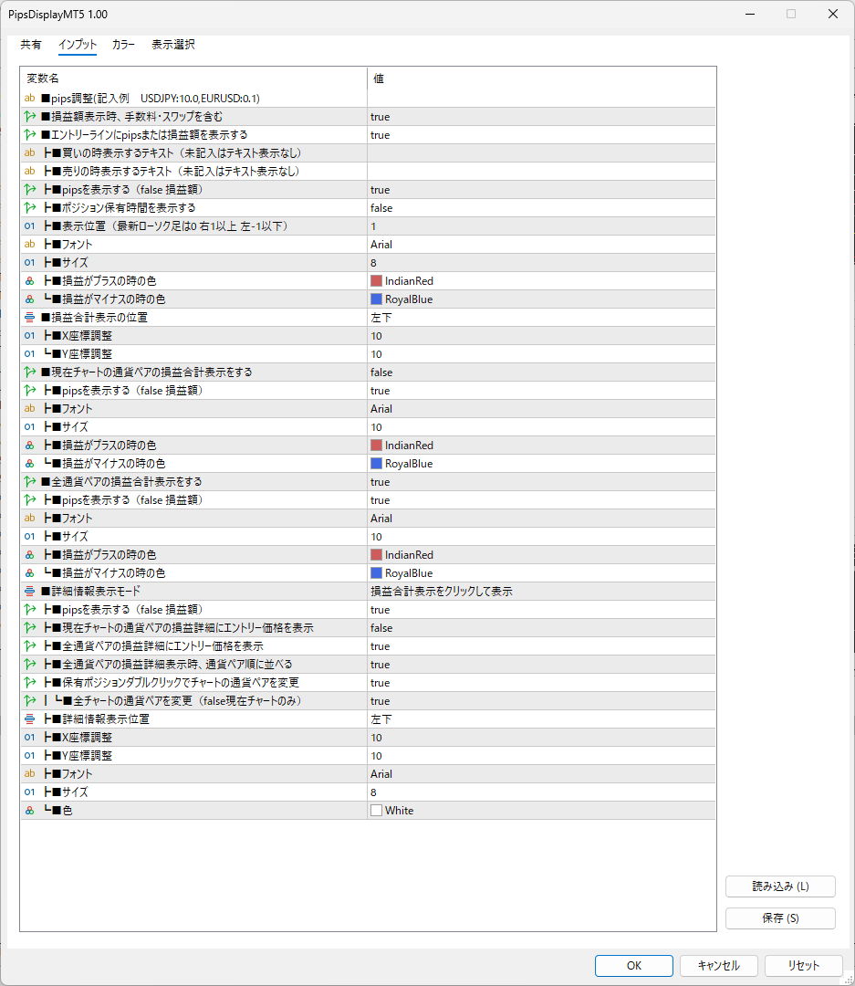 - pipsを表示する(false 損益額) 損益額を表示させる時はfalseにしてください ※pips表示の時は後ろにpipsと表示されます