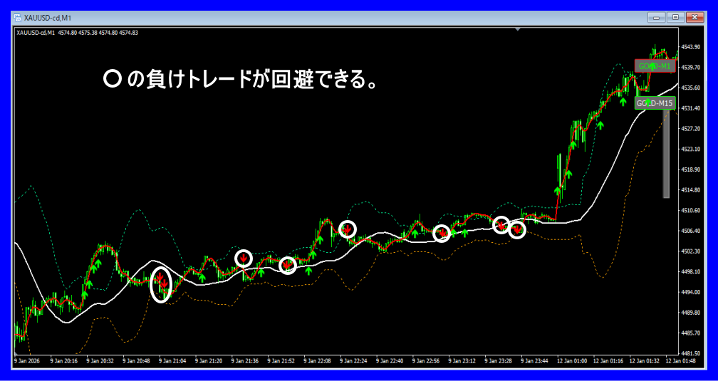 - ● GOLDの「ノイズ」に刈り取られて終わる 値動きの激しいGOLDで、小さな押し目で出たサインに反応して即死。ボラティリティに合わせた「逃げ」や「待機」のタイミングが掴めていない。