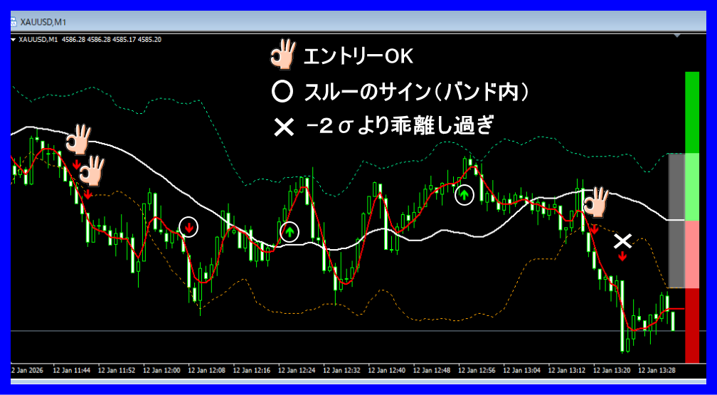 ■ プロの判断基準: 理想的なエントリーは「バンドを抜けた直後」や「バンドに沿ってジリジリと動いている時」です。バンドから「ワープ」したように大きく飛び出した後のサインは、一度バンド付近まで価格が戻ってくるのを待つのが、長期的に利益を残す秘訣です。