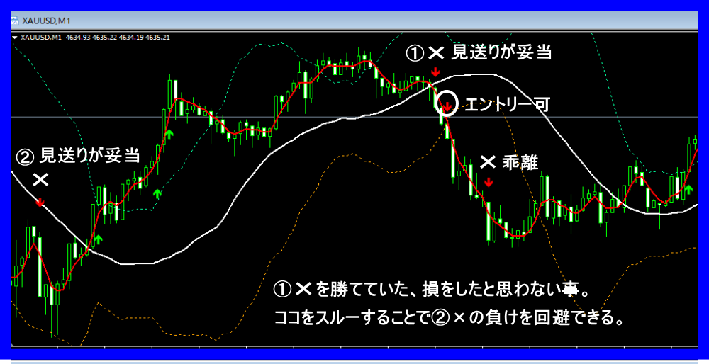 お手持ちのサインツールで矢印が出た際、価格がドットライン(バンド)から大きく外側へ離れすぎている場合は、以下のリスクを考慮して見送るのが妥当です。
