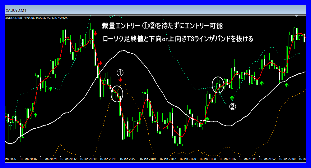 T3ラインは価格を極限まで滑らかにしたもの。これがバンドを抜けるということは、一時的なノイズではなく「本物のトレンド」が発生した強力な証拠となります。この状態でサインが点灯すれば、非常に期待値の高いエントリーポイントとなります。
