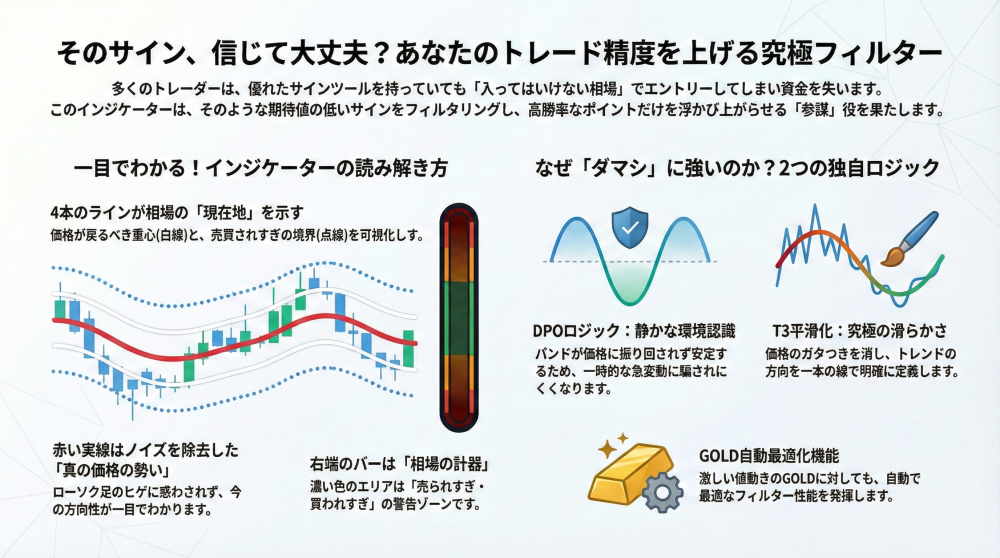 このインジケーターは単なるフィルターではありません。相場の「地合い」を読み解き、勝率の高いポイントを絞り込むための**コンパス**です。