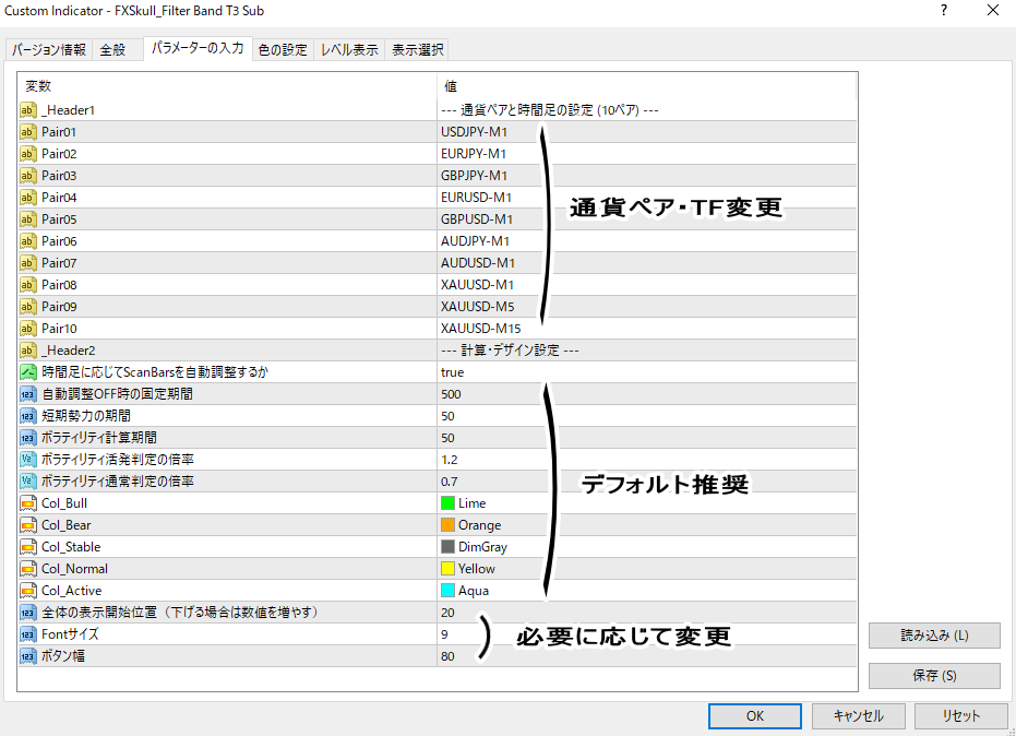 | Pair01 ~ Pair10 | 表示したい通貨ペア(気配値)と時間足を指定します。M1~H4 ブローカーの接尾辞(Suffix)は自動判別するため入力不要です。 ※空欄にするとその列は表示されません。 | USDJPY-M1 XAUUSD-M5 |