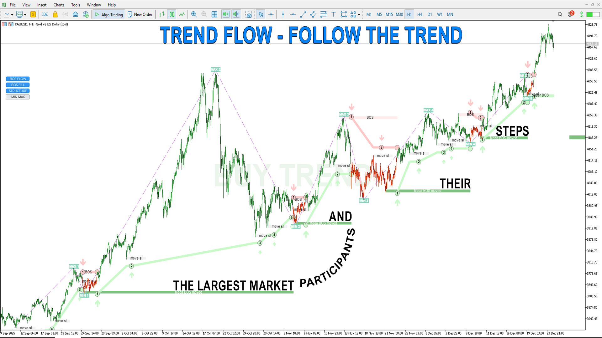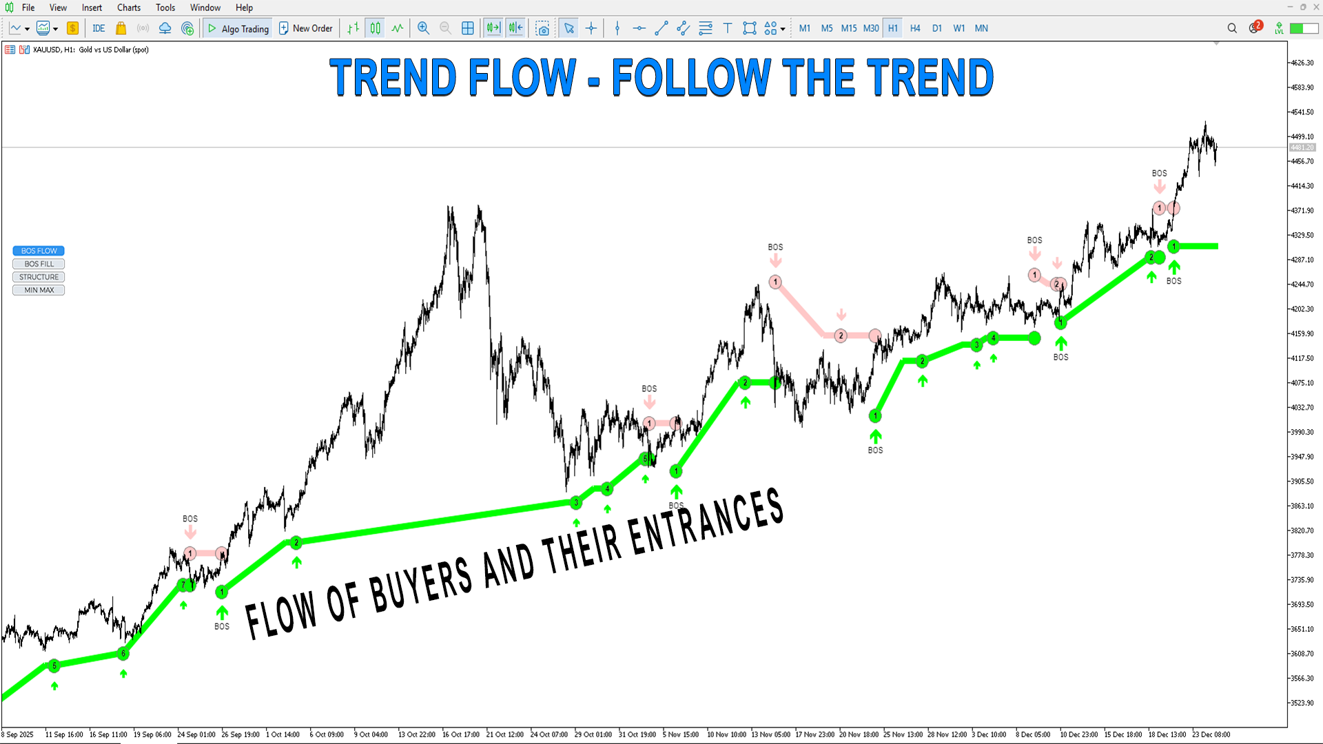 BOS FLOW– トレンド波と実際のトレンド変化、これらは主要プレイヤーのエントリーと彼らの存在の確認(数字で示されます)。