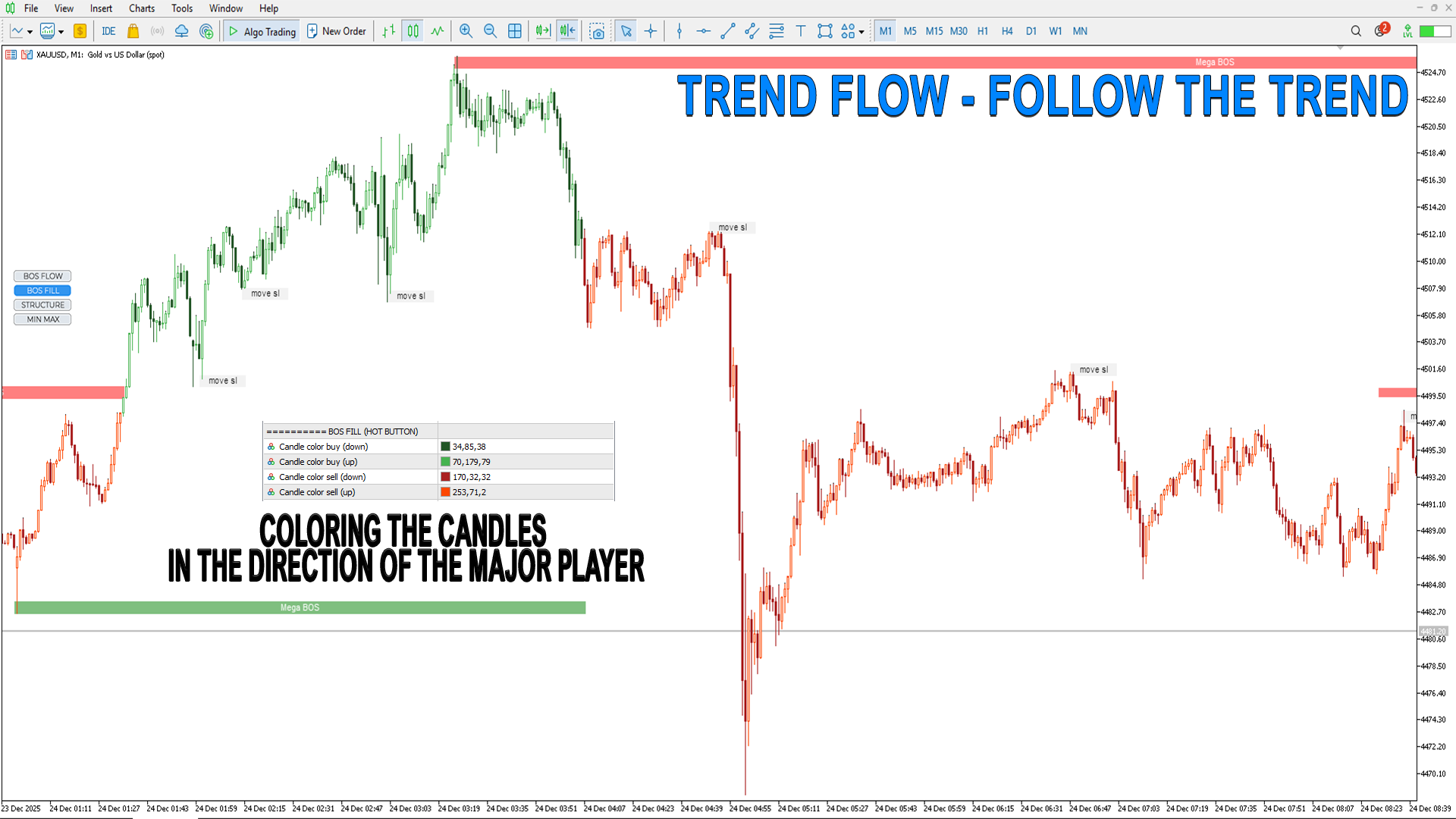 BOS FILL– トレンド方向へのバーを埋めます。これは「主要プレイヤー」のエントリーポイントとトレンドの反転を示します。