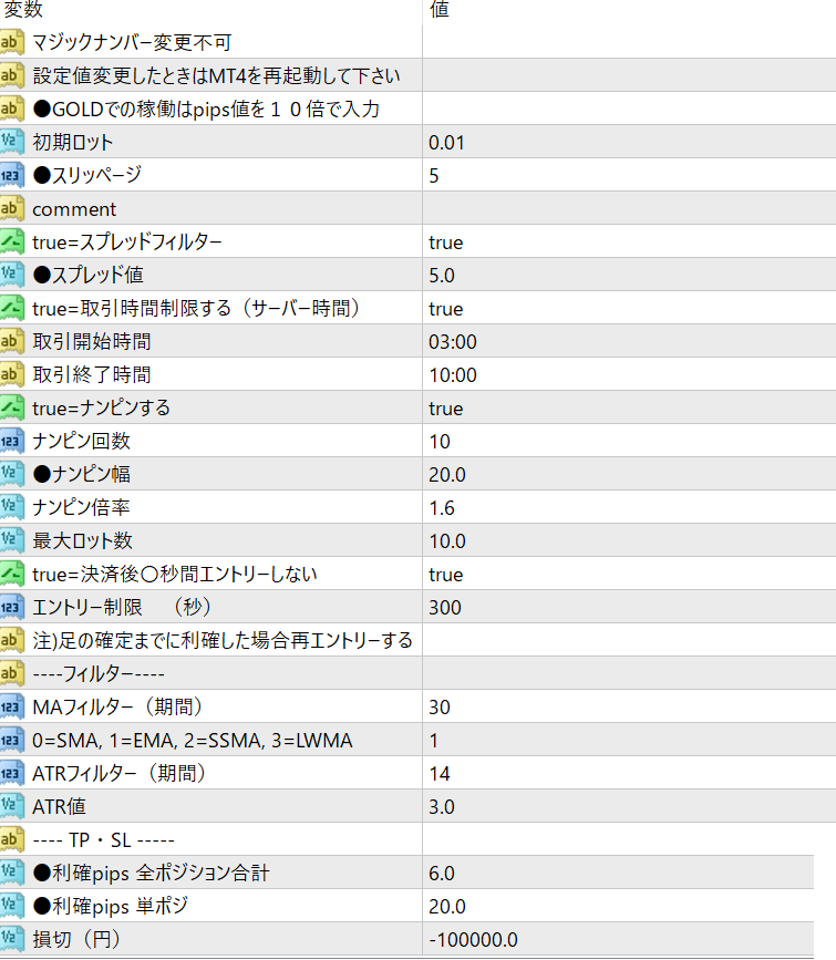 損切金額設定可。ナンピン設定可。フィルターあり。