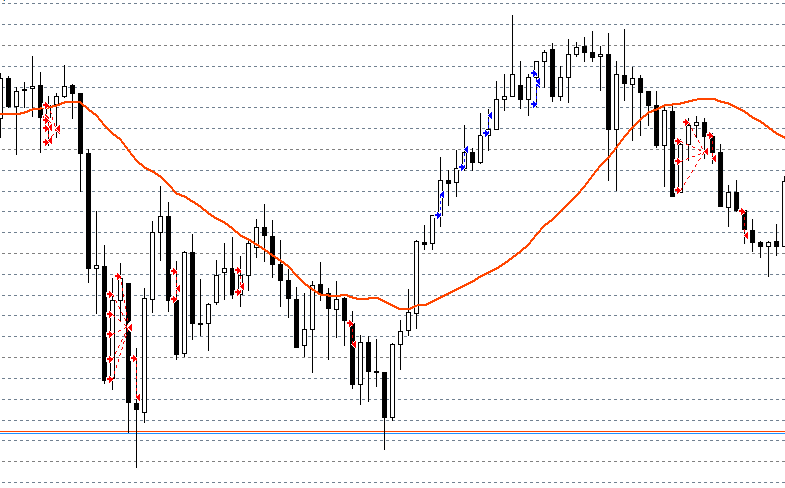 包み足の出現によりEMA30より上で、ロングエントリー、下でショートエントリーしています。この期間内では、損切りはありません。
