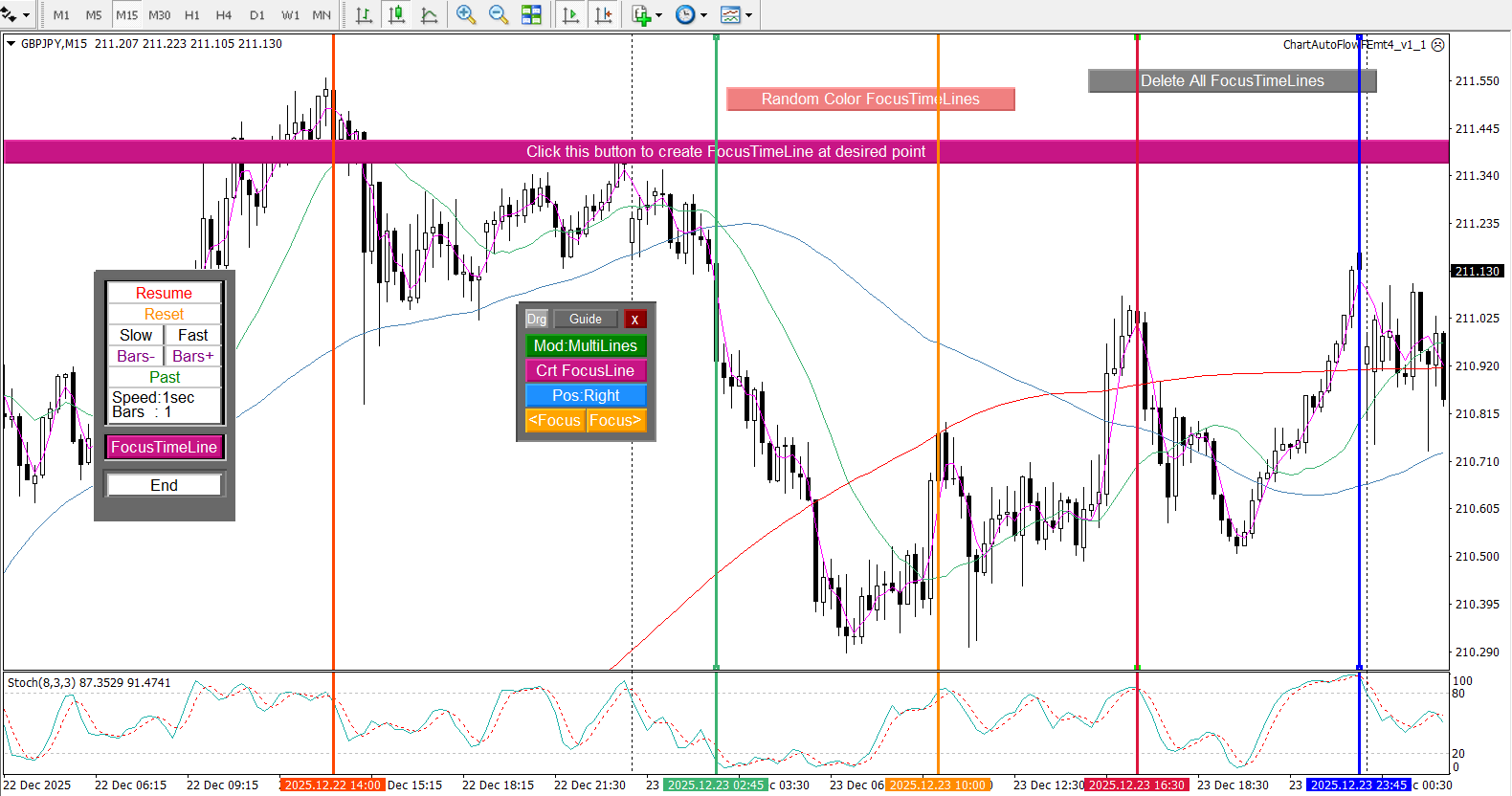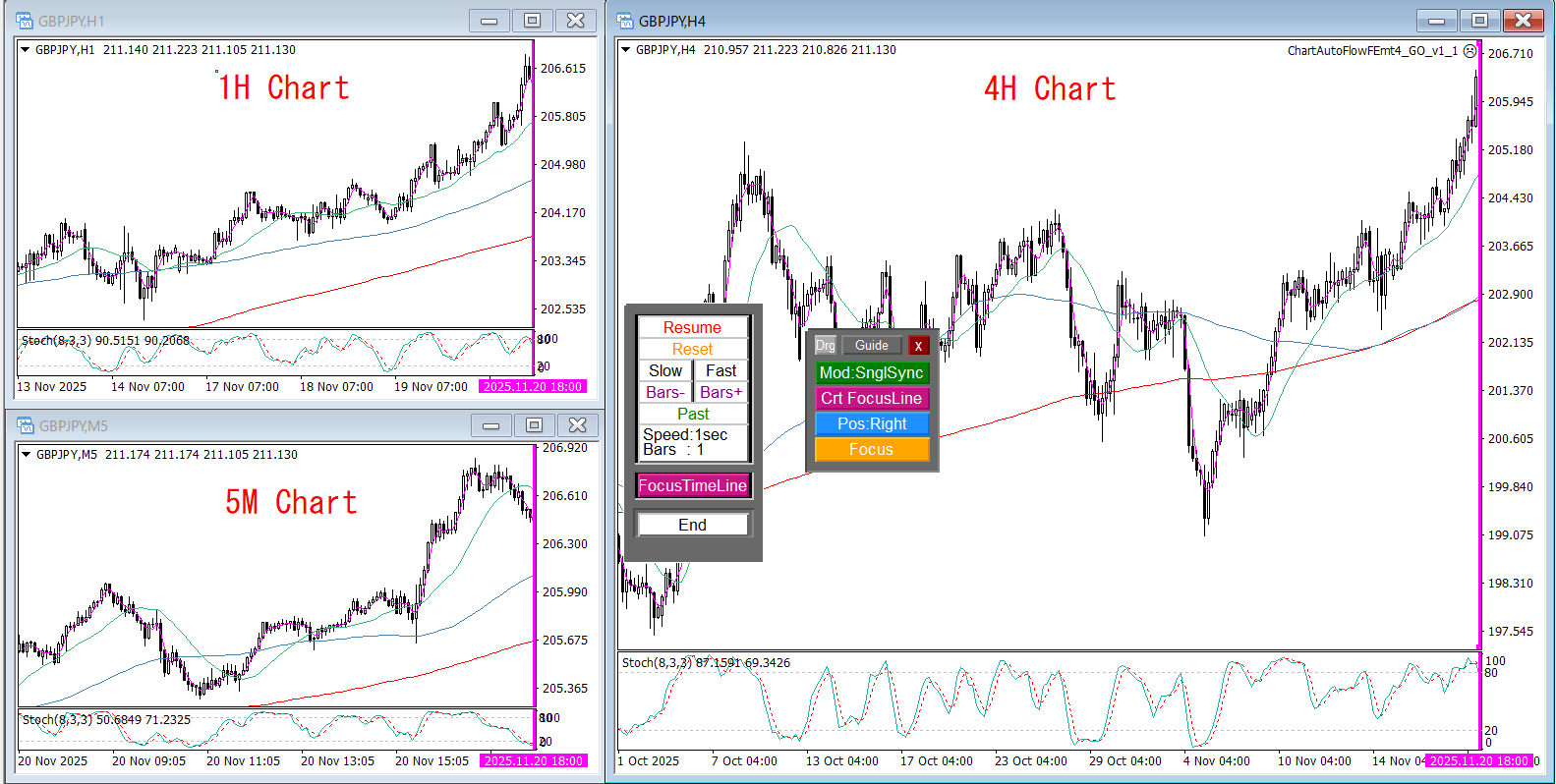 チャート検索及び模擬トレード効率を最大化する「Chart Auto Flow」と分析精度を高める「Focus Time Line」を完全統合した、MT4専用の強力なハイブリッドツールです。統合型なので分析作業を分断せず効率的で、さらにこれらの機能の合わせ技でより高度なシミュレーションが可能です。