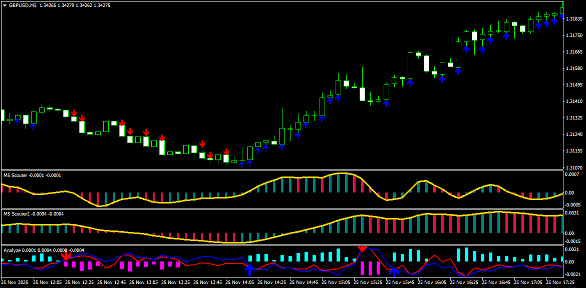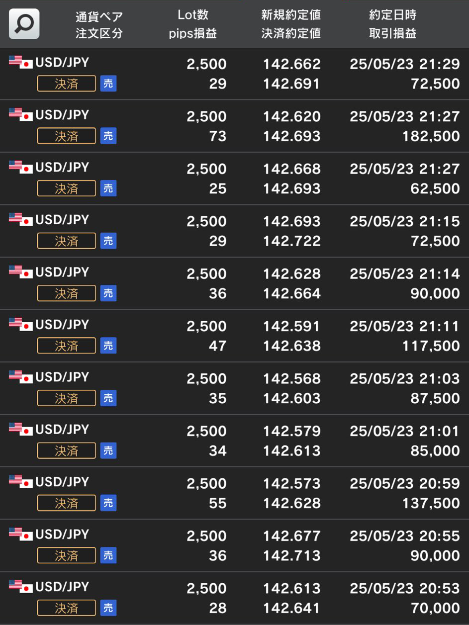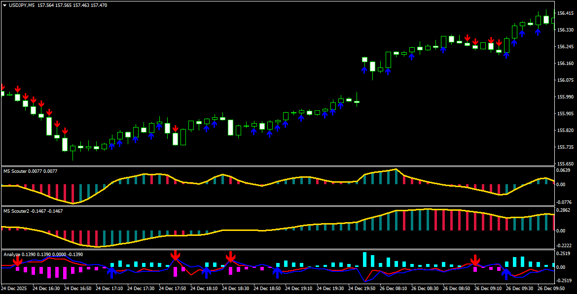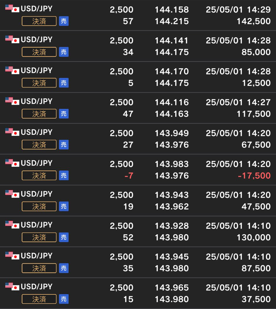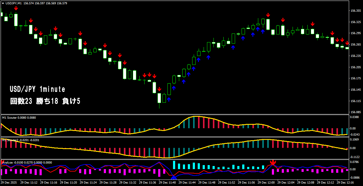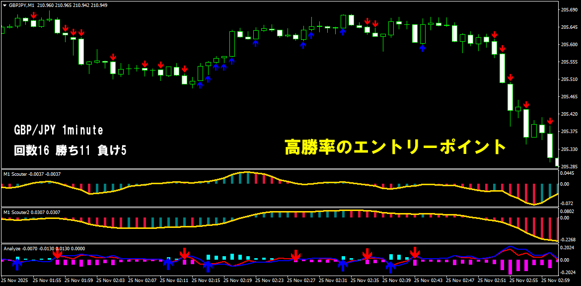 実際に、 スタート時の資金はおよそ10万円ほどでしたが、 この方法でトレードを続けることで、 1カ月という短い期間でも、大きく資金を増やすことができました。 一度の勝負にすべてを賭けるのではなく、 流れに乗りながらコツコツ積み重ねていく。 そんな安心感のあるトレードができるのも、 この連続矢印サインの強みです。 ■トレード事例 「Sparking!FX」は、 特定の時間だけでなく、さまざまな取引時間に対応できるのが特長です。 短い時間の取引では、 1分や5分足の取引ととても相性がよく、 テンポよくチャンスを見つけることができます。 また、 15分以上の少し長めの時間でも、 矢印が連続して出る場面を活かすことで、 無理なく利益を積み重ねていくことが可能です。 そのため、 相場の流れにうまく乗れたときには、 思っているよりも早いペースで収益が増えていくことも珍しくありません。 これからご紹介するのは、 実際のチャートを使ったトレード事例です。 一度に大きく狙うのではなく、 安定した勝率を保ちながら、コツコツと+5~20pips程度の利益を積み上げていく そのイメージをぜひご覧ください。