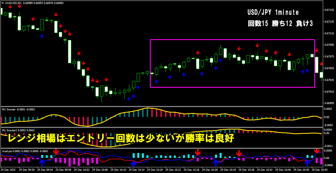 上のチャート例では、 22回以上エントリーして、20勝2敗という結果になっています。 また、サブチャート上に表示されている3つのツールは、 エントリーして良い場所とエントリーをしない方がよい場所を示しています。 このツールは常に相場の分析を続けているため、 勝ちにくい場面では方向性を表示し、 無理なエントリーをしないようにしてくれます。 その結果、ムダな取引を自然と減らすことができます。 【トレンド・レンジ相場の分析ツール】 「Sparking!FX」には、 サブチャートに表示されるトレンドとレンジ相場を見分ける専用ツールも搭載されています。