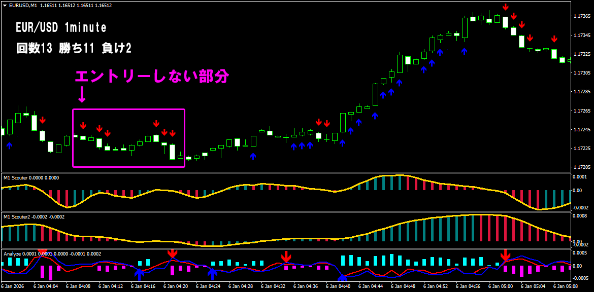 このように、 少し前のローソク足から相場の方向を分析し、 勢いが続いているポイントで矢印が連続して出る仕組みになっています。 そのため、 自分であれこれ考えたり、迷ったりする必要はほとんどありません。 サインが出たら、 その流れに合わせてトレードするだけ。 「判断に迷ってチャンスを逃す」 「エントリーが遅れてしまう」 そんな悩みを減らし、 シンプルで分かりやすいトレードを実現します。