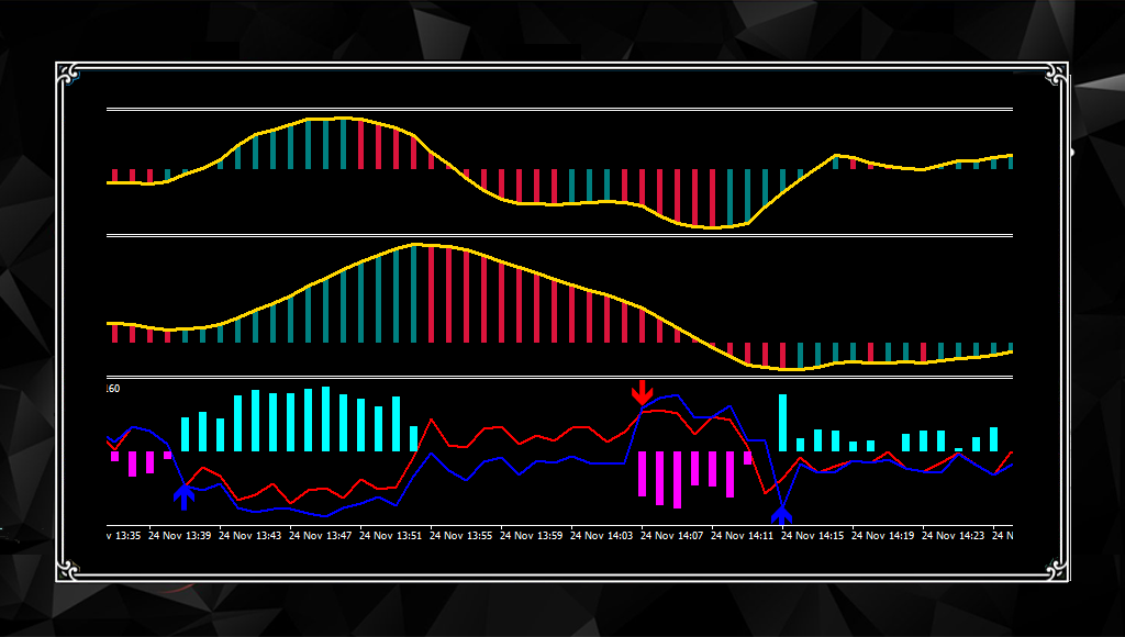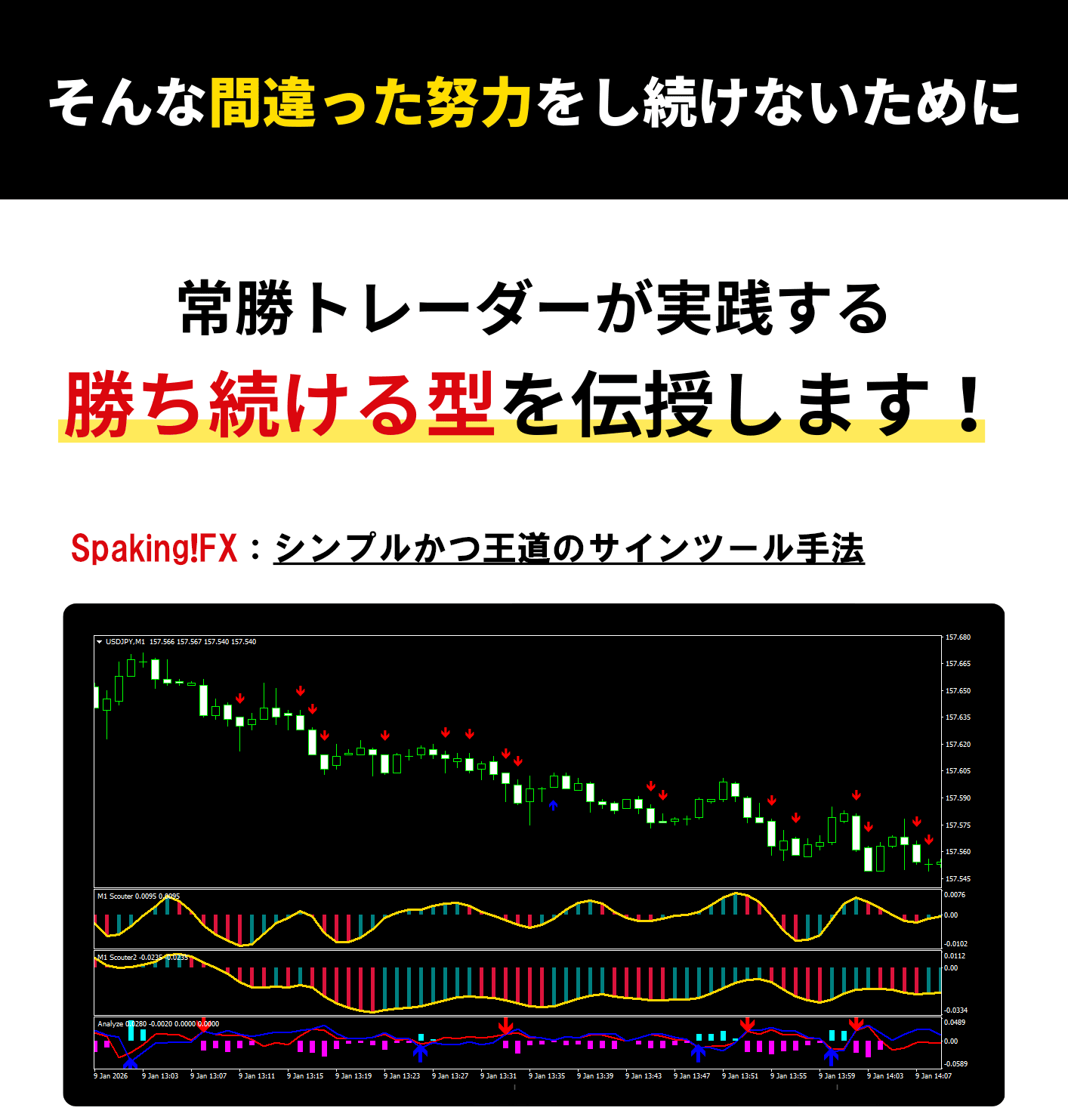 これらの機能を活用することで、 無駄なエントリーを減らし、連勝を狙いやすいトレードが可能になります。 「矢印に振り回されるトレード」から、 「根拠を持って狙うトレード」へ。 Sparking!FXは、 そんなトレードスタイルを目指す方のためのツールです。 ■トレードは「考えすぎず」サインに従うだけで完結します! 「Sparking!FX」は、 いくつかの分かりやすい表示を組み合わせて作られています。 ● メインチャートに表示される矢印サイン ● サブチャートで表示される、トレンドか横ばいかを見分ける分析ツール ● サブチャートで表示される、トレンドの強さを分析するツール これらを一緒に使うことで、 今はトレードしていい場面なのかが一目で分かります。 中でも一番大切なのが、「連続矢印サインツール」です。 このツールは、ローソク足の動きを細かくチェックし、 相場に勢いがあると判断したときだけ、 矢印を連続して表示します。(※下図チャート参照)
