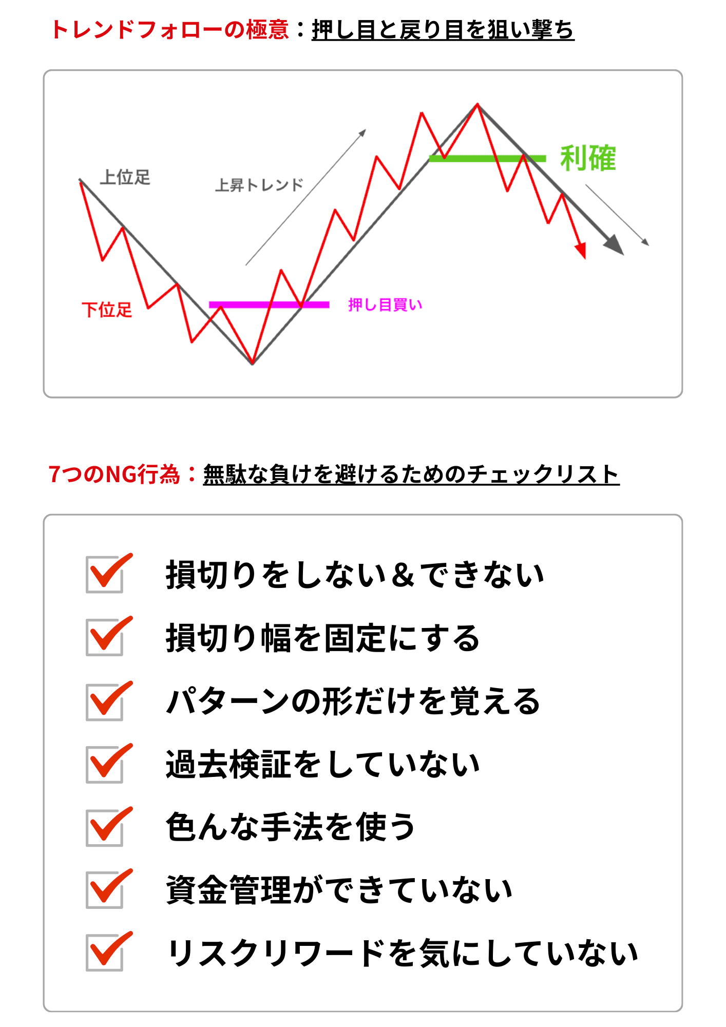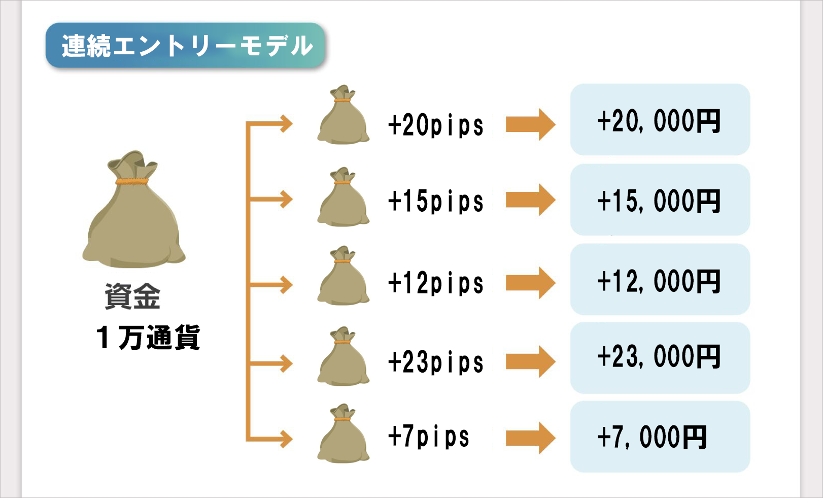 これまでのサインツールは、 「たまに出る矢印」に全力でエントリーする使い方が多かったと思います。 しかし、ローソク足にはだましと呼ばれる、 一時的に逆に動く場面もよくあります。 1回のサインにすべてを賭けるよりも、 トレンドが続いている範囲で、ポジションを分けて何度もエントリーする方が、 無理がなく、効率よく勝ちやすくなるのです。 この考え方が、 連続矢印を使ったトレードの大きな強みです。