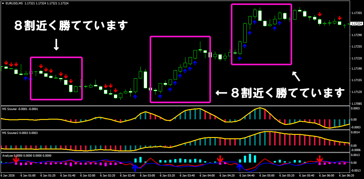 この矢印サインツールは、 トレンドが続いていて、なおかつローソク足の動きに強い勢いがあるとき、 矢印が1回だけでなく、何回も続けて表示されます。 つまり、 「今はまだ流れが続いていますよ」 「まだチャンスが終わっていませんよ」 という合図でもあります。 このタイミングで、 矢印が出るたびに分けてエントリーしていきます。 すると結果として、 エントリーしたうちの約8割が+5~20pipsの利益で終わるという流れになりやすくなります。 エントリー回数を増やし、 1回ごとの掛け金を抑えて分散することで、 リスクを小さくしながら安定したトレードが可能になります。