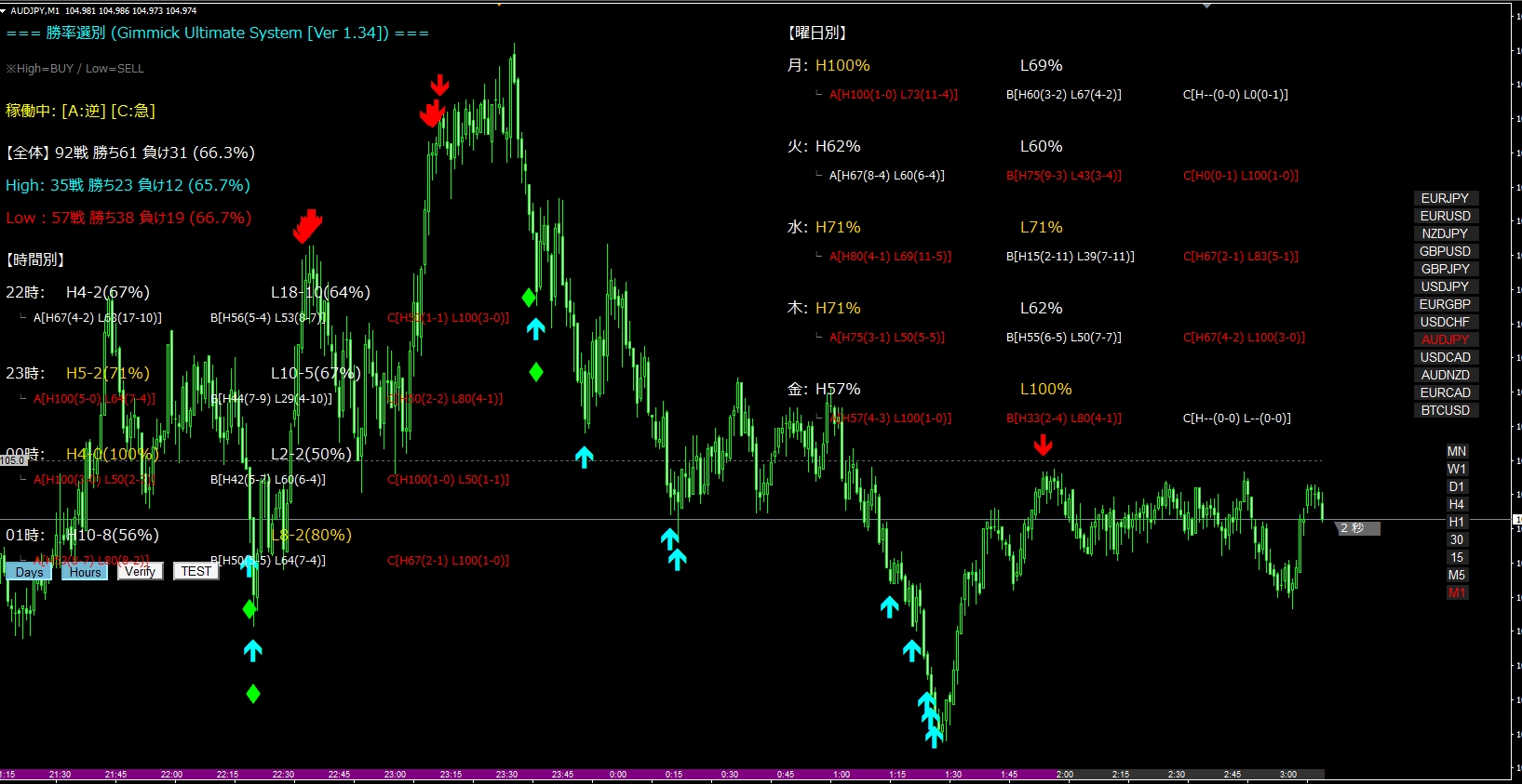勝率表示 全体の傾向を確認 時間帯別・曜日別・方向別(HI/LOW)で詳細表示