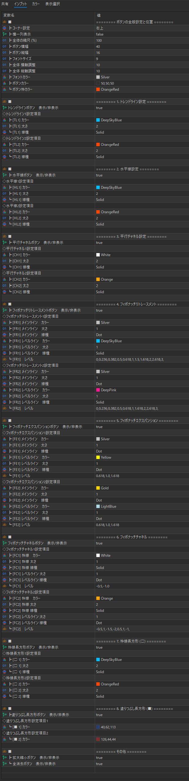 フィボナッチリトレースメント、フィボナッチエクスパンション、フィボナッチチャネルはそれぞれレベルラインも1と2に分けて独自に設定可能です。
