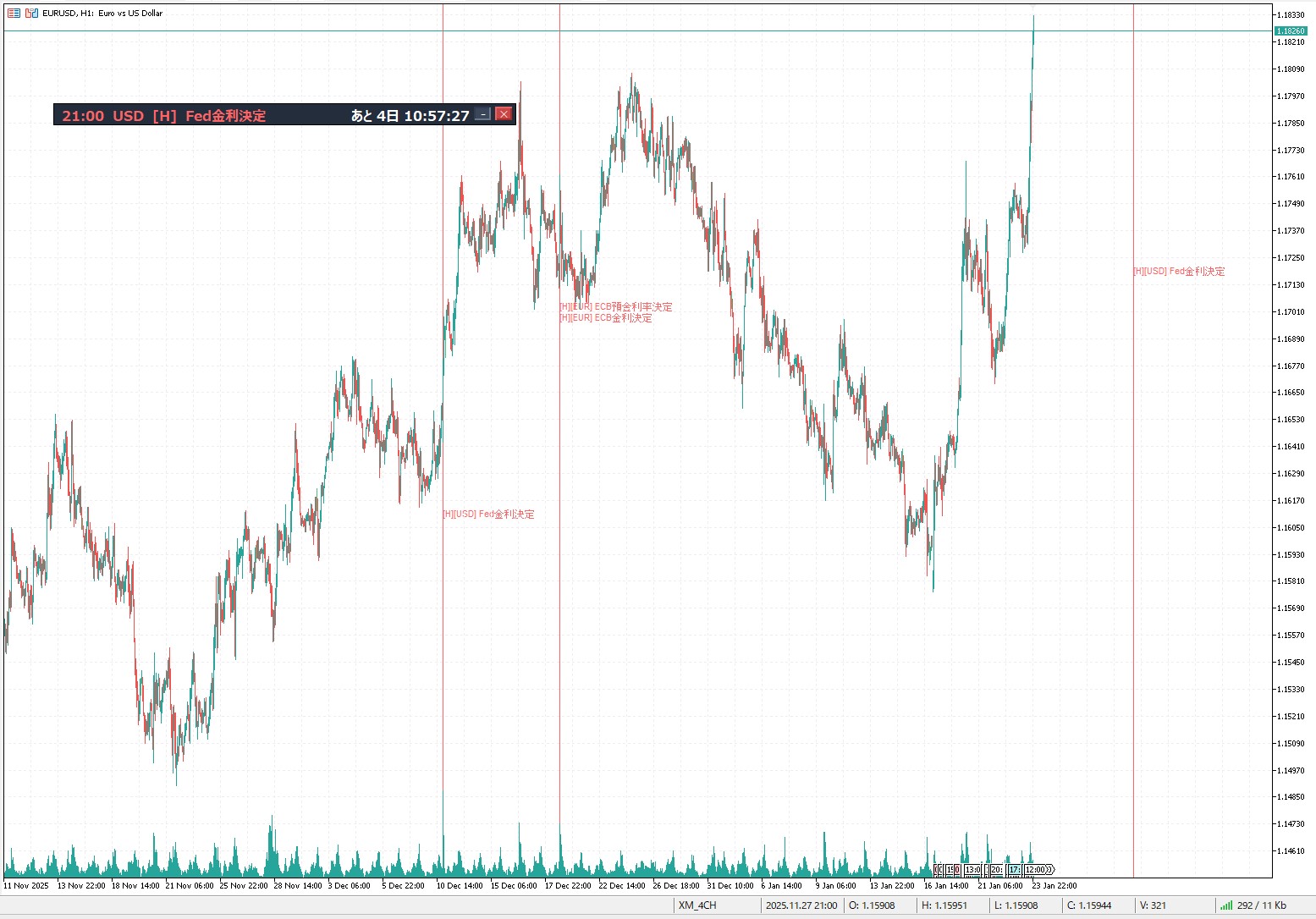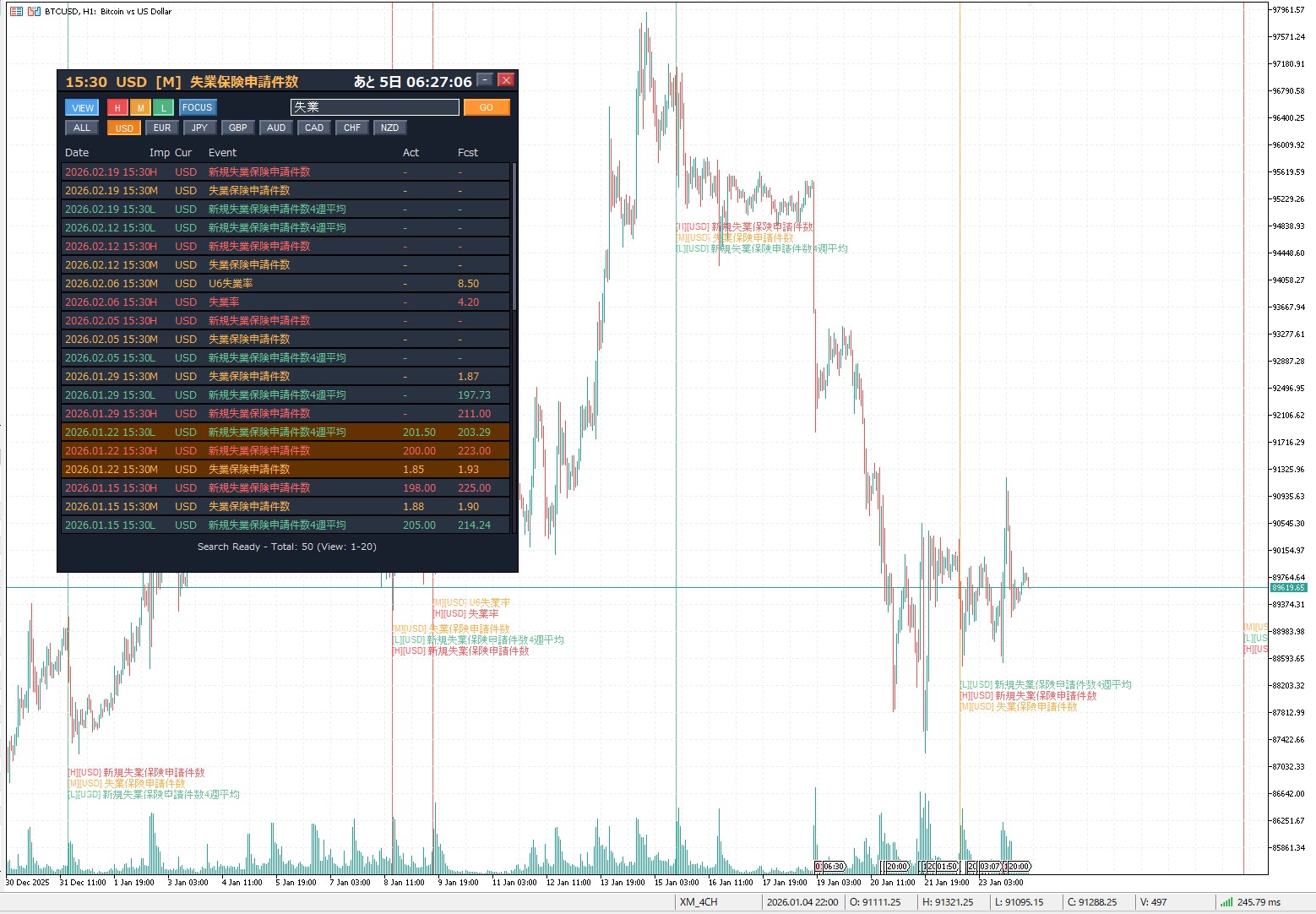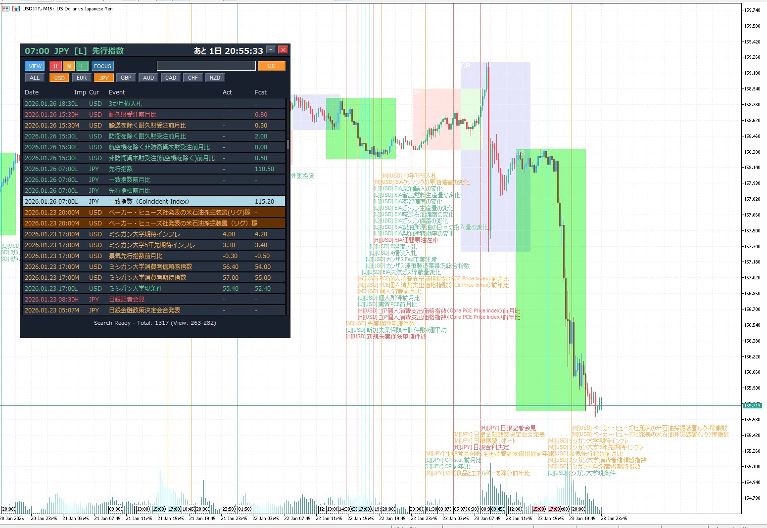 ※上記は、最小化モードで、チャート上の表示と、フィルタリング条件に合致した直近のイベントまでのカウントダウンがダッシュボードのバーに表示されます。