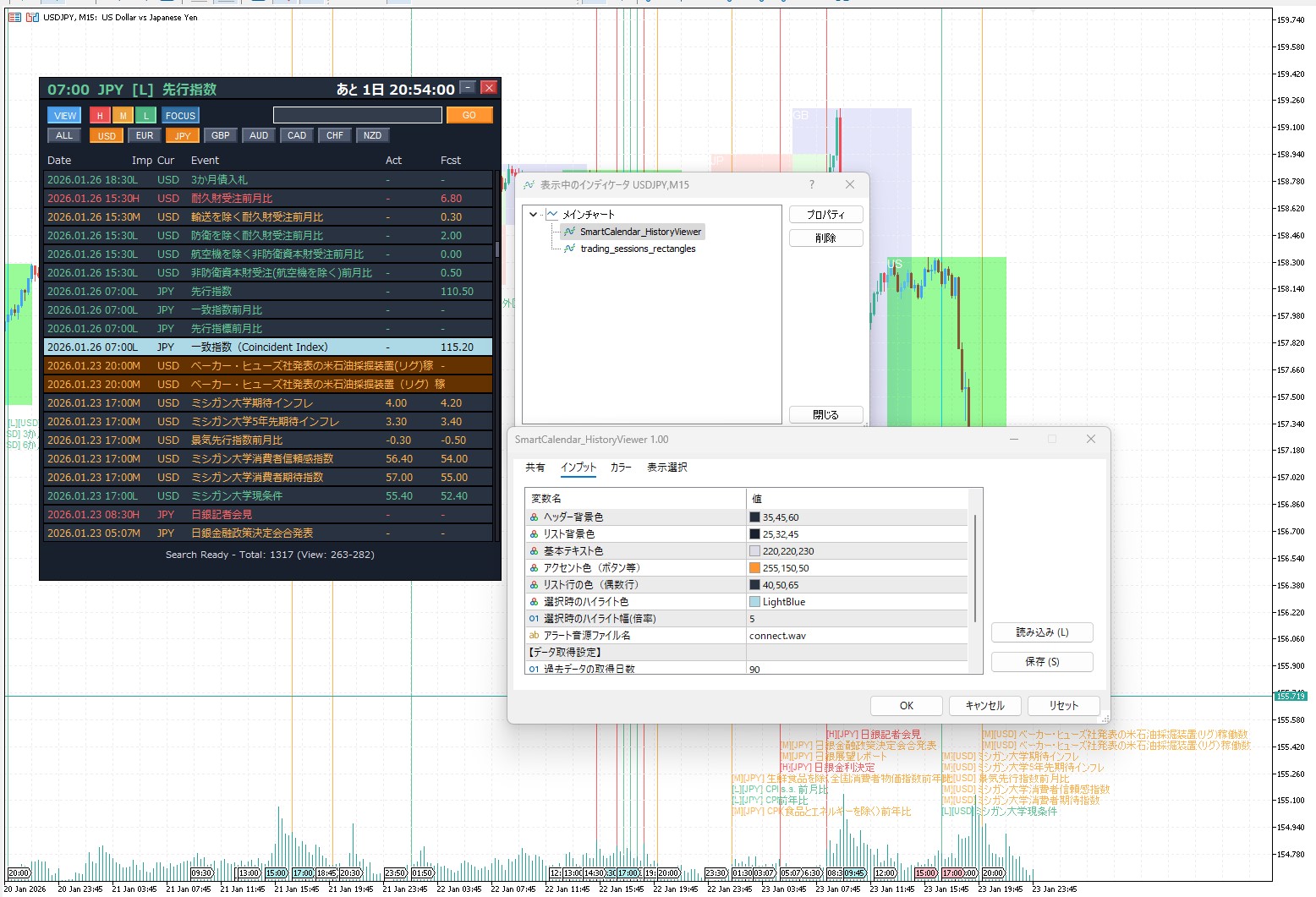 **Smart Calendar** は、MetaTrader 5のチャート上に経済指標データを直接プロットし、リスト表示とライン描画で「時間」と「値動き」を完全にリンクさせるツールです。