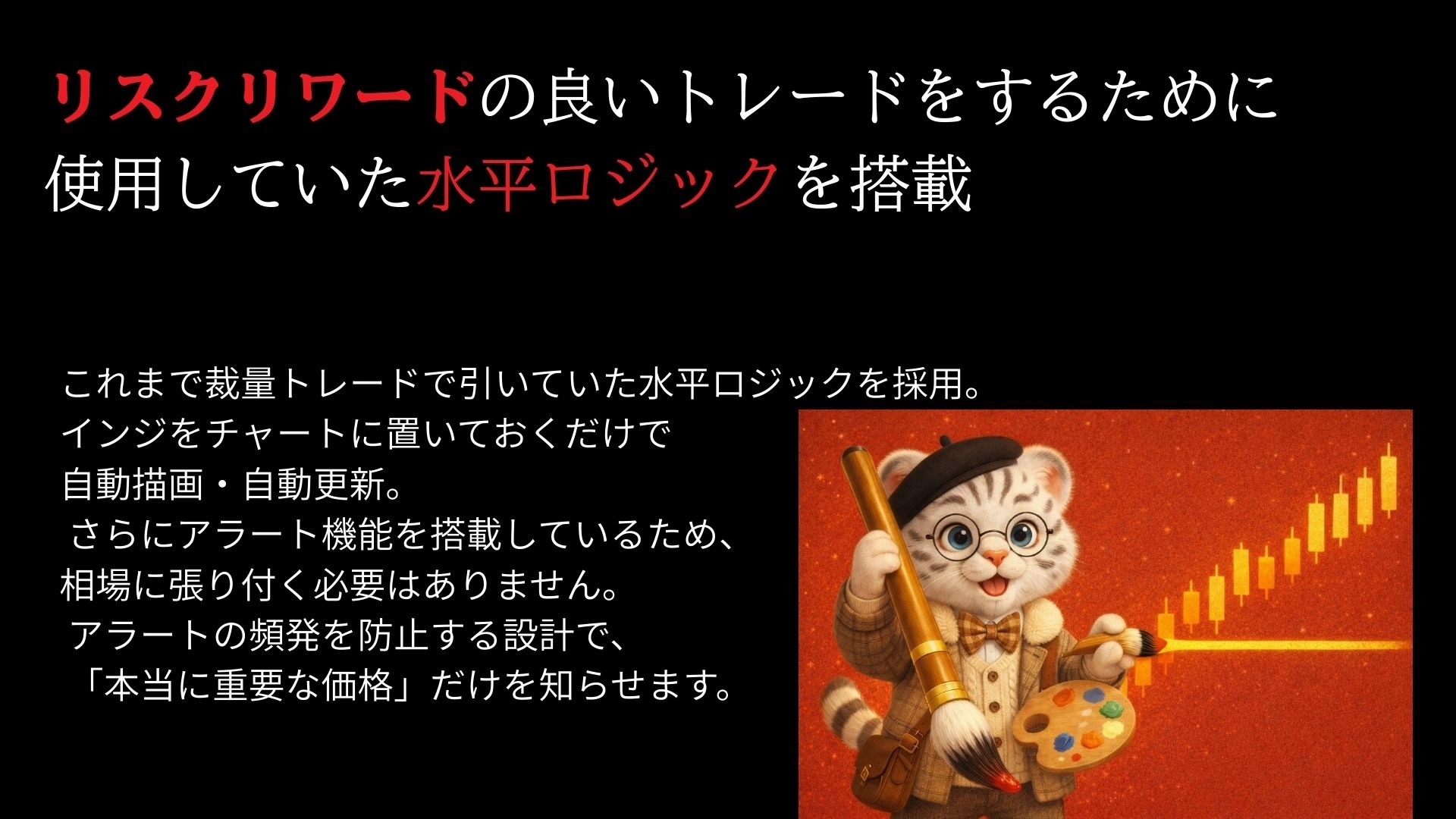 さらにアラート機能を搭載しているため、相場に張り付く必要はありません。アラートの頻発を防止する設計で、「本当に重要な価格」だけを知らせます。