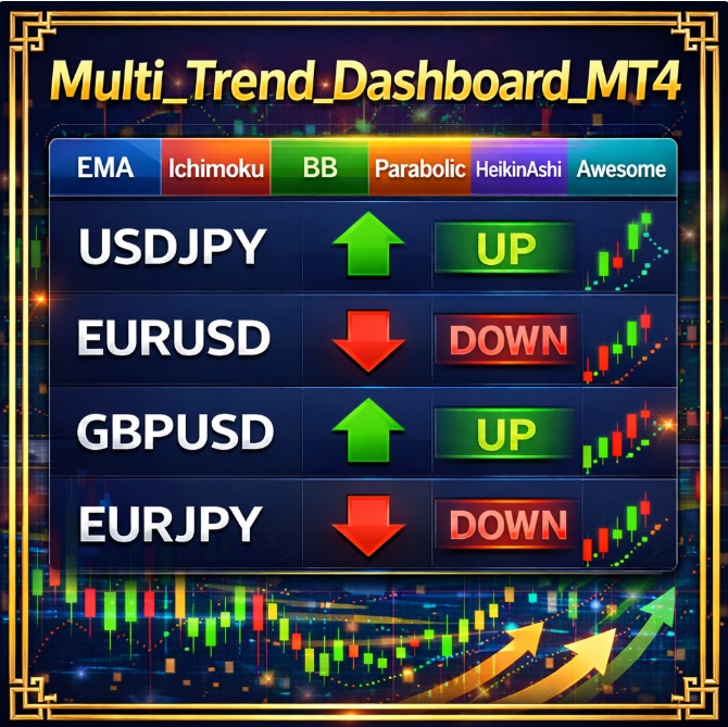 - エントリーの根拠に: 先に作成した「EuroTrend_H1_ATR」などのEAと併用し、EAのサインが出た際にこのダッシュボードでも同方向に色が揃っているか確認することで、トレードの勝率向上が期待できます。