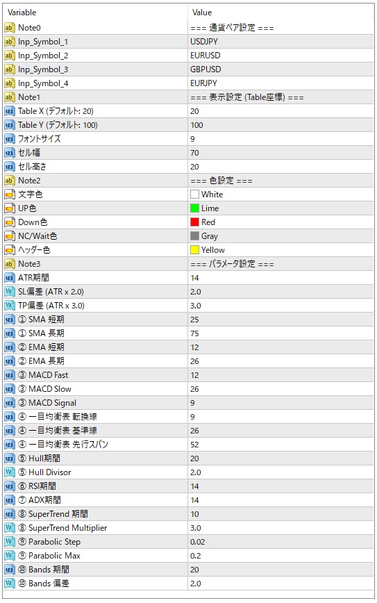 ※その他、各インジケーターの期間(SMA_Periodなど)も詳細に設定可能です。
