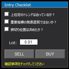 本ツールの最大の特徴は、「3つのチェックボックスすべてにチェックを入れないと、BUY/SELLボタンが押せない(反応しない)」という安全設計です。 どれだけ相場が急変動しても、ルール確認なしでの飛び乗りエントリーを物理的にブロックします。