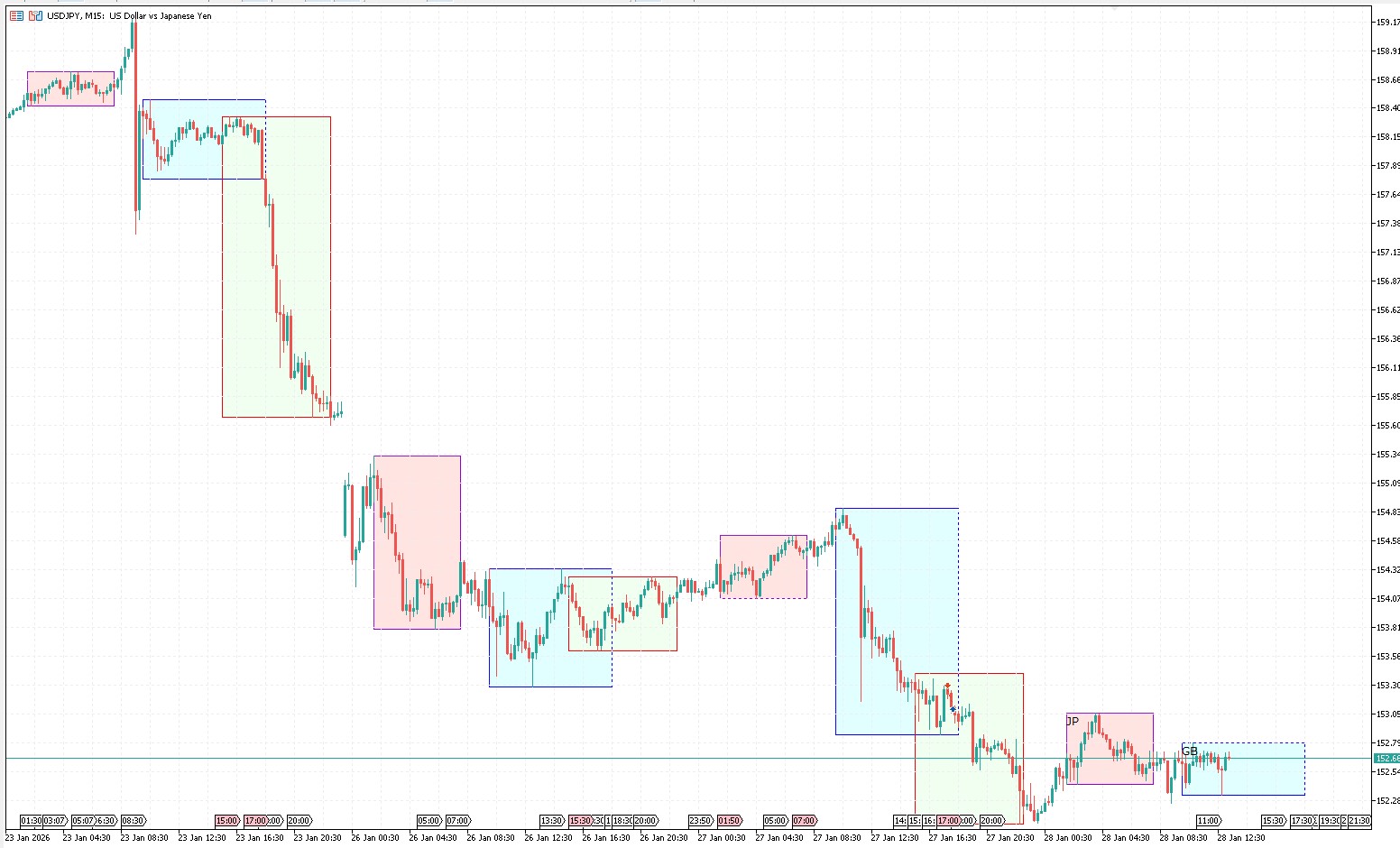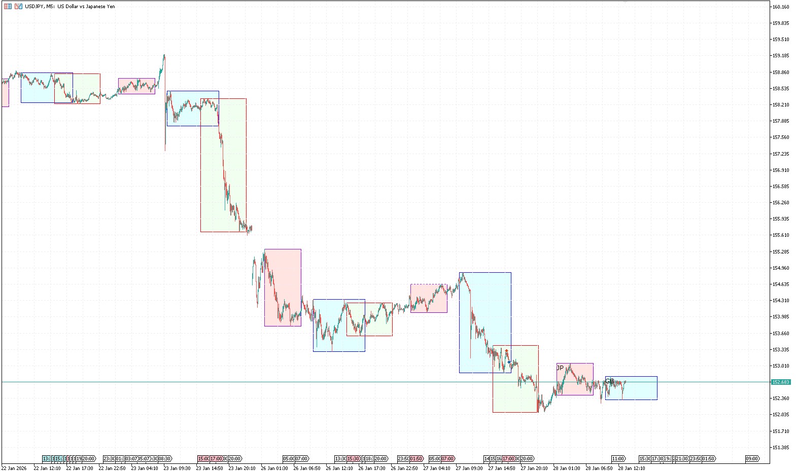 FXトレードにおいて、「今はどの市場の時間帯なのか?」を意識することは非常に重要です。 本インジケーターは、アジア(東京)、欧州(ロンドン)、米国(ニューヨーク)の3大市場の時間を、チャート上にわかりやすくボックス表示します。 無料ツールとして公開しますが、機能は実用十分です。 「ごちゃごちゃした機能はいらない、シンプルに時間を把握したい」という方におすすめです。 ## 主な特徴 1. **視認性抜群の3市場表示** - アジア、欧州、米国の時間を色分けして表示。 - 重なっている時間帯(ロンドン・NYの重なりなど)も一目でわかります。 2. **軽量設計** - チャート動作を重くしないよう、内部ロジックを最適化済み。 - 「過去何日分を表示するか」を指定できるため、長期間のチャートでも快適に動作します。 3. **好みの見た目にカスタマイズ** - 「枠線のみ」「背景塗りつぶし」「両方」など、描画スタイルを選択可能。 - 色、線の太さ、市場名のラベルフォントまで細かく設定できます。 ## パラメータ設定 - **ShowLine / ShowMask**: 枠線や塗りつぶしのON/OFF - **DaysToDisplay**: 表示する過去の日数(推奨: 50日程度) - **Asia/Europa/America設定**: - 各市場の開始・終了時間(サーバー時間) - 表示色 - 市場名ラベル(例: "JP", "LDN", "NY" など自由に変更可) ## 指定環境 - MetaTrader 5 (MT5) ## 開発者より シンプルな機能ですが、トレード環境の基礎としてお役立てください。 もし気に入っていただけたら、他の有料ツールもチェックしていただけると嬉しいです!